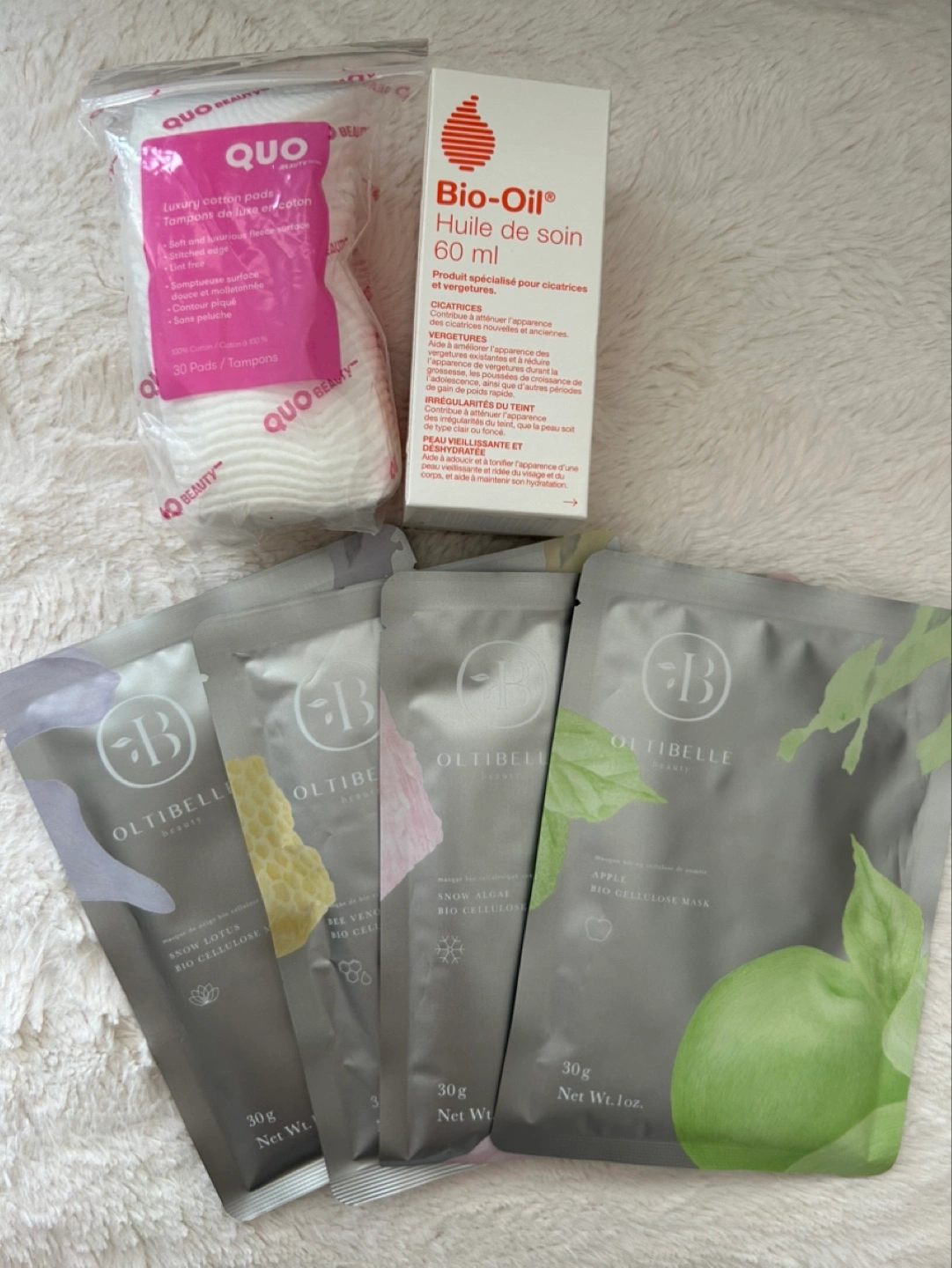 200Bundle includes: 30 Quo luxury cotton pads, 60ml Bio-Oil skincare oil, four Oltibelle bio cellulose masks (Snow Lotus, Bee Venom, Snow Algae, Apple).