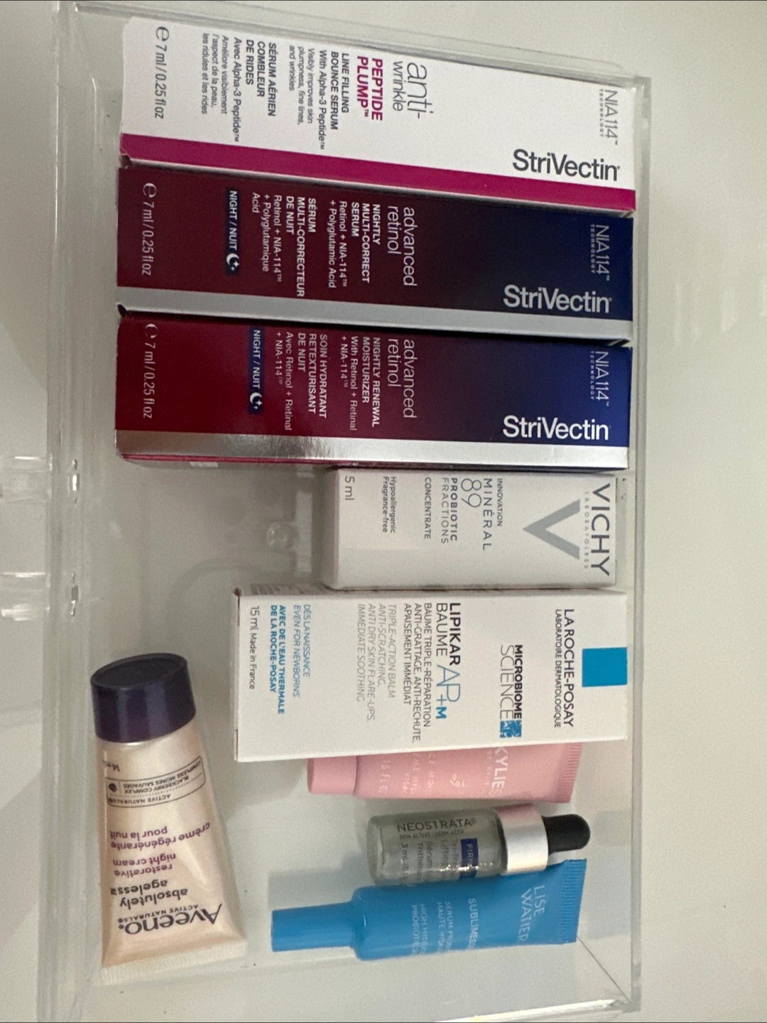 Selling a skincare lot featuring various brands and products: - Strivectin Anti-Wrinkle Peptide Plump Line Filling Bounce Serum (7ml/0.25 fl oz) - Strivectin Advanced Retinol Nightly Multi-Correct Serum (7ml/0.25 fl oz) - Strivectin Advanced Retinol Nightly Renewal Moisturizer (7ml/0.25 fl oz) - Vichy Mineral 89 Probiotic Fractions Concentrate (5ml) - La Roche-Posay Lipikar Baume AP+M Triple-Action Balm (15ml) - Aveeno Absolutely Ageless Restorative Night Cream - Neostrata Firming Serum - Lise Watier Sublimessence High Hydration Serum