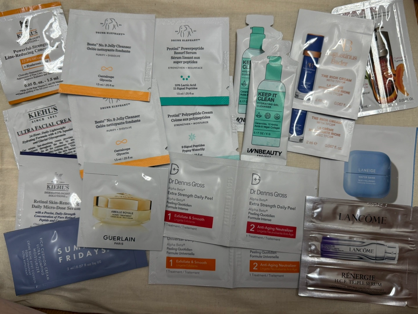 85Pickup only, individual are also for sale dm for price. Take all for 20. This bag contains: - Kiehl’s Power-Strength Line Reducing Concentrate - Kiehl’s Untra Face Cream - Kiehl’s Retinol Skin Renewing Daiky Micro Dose Serum - Summer Friday Rich Cushiin Freak Ultra Plumping Moisturizer - Drunk Elephant Beste No.9 shelly Cleanser *2 - Drunk Elephant Protini Powerpeptide Resurf Serum - Drunk Elephant Protini Polypeptide Cream - INN Beauty Keep It Clean Hydrating Gel Cleanser *2 - Dr Dennis Gross Alpha Beta Universal Daily Peel - Dr Dennis Gross Alpha Beta Extra Strength Daily Peel - Leneige Water Bank Intensive Moisturizer - AB Augustinus Bader The RICH cream with TFC8 *2 - Clarins Double Serum - Lancôme HCF Triple Serum - Guerlain Abeille Royale Honey Treatment Rich Cream - MERIT Great Skin Priming Moisturizer - Bobbi Brown Vitamin Enriched Face Base *2 - Clarins Extra Firming Jour (Day Cream) 15ml - Clarins Extra Firming Nuit (Night Cream) 5ml - Summer Friday Lip Butter Balm in Shade Pink Sugar 10g - Glow Recipe Plum Plump Hykuronic Cream 10ml - Milk Makeup Hydro Grip Primer 4ml (a half used one as a gift) - Holitual Concentrate Signature Cream Light