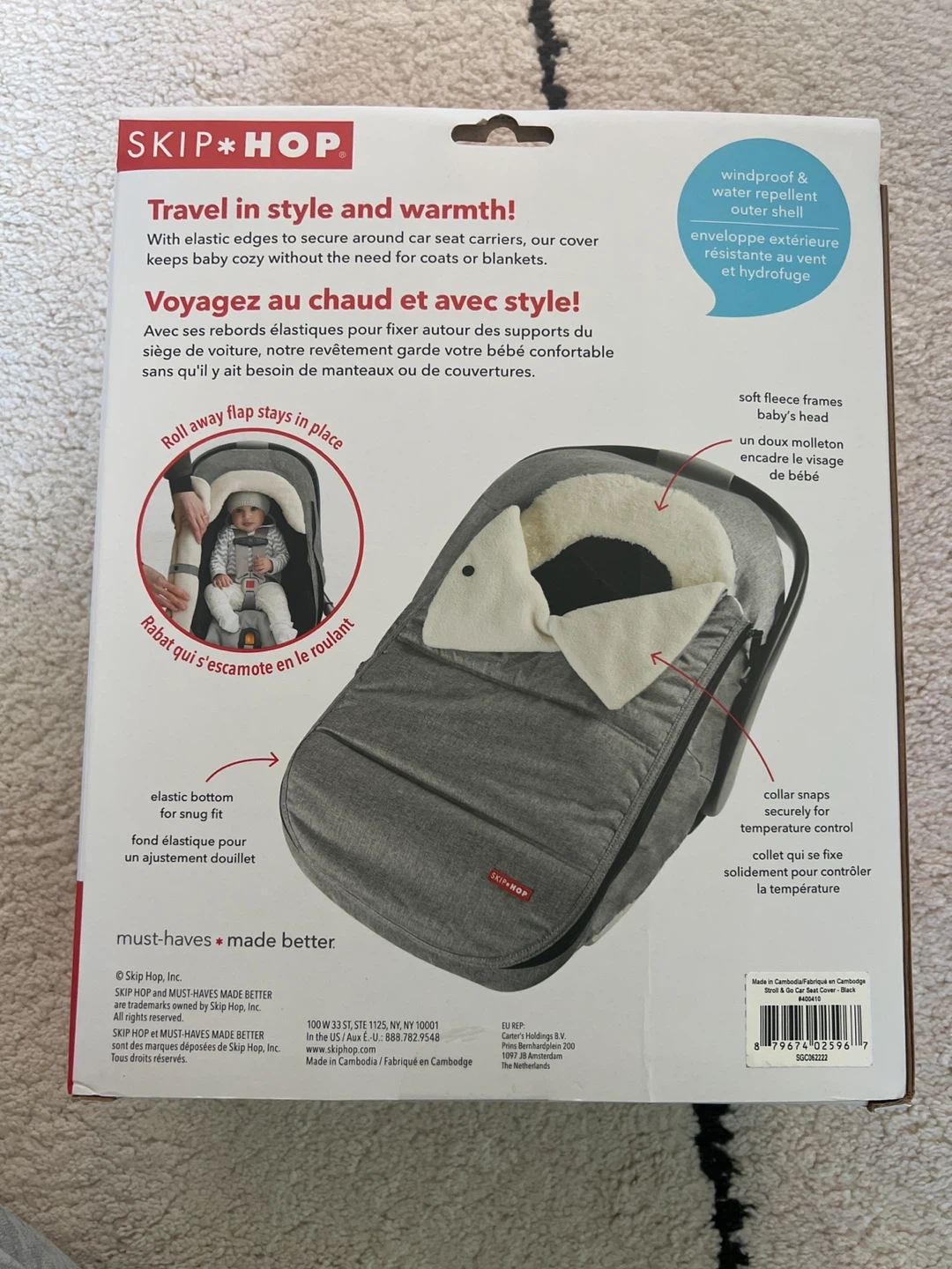 60Keep your little one cozy with this Skip Hop Stroll & Go car seat cover! It features elastic edges to secure around car seat carriers, ensuring your baby stays warm without the need for bulky coats or blankets. The cover is windproof and water-repellent, with a soft fleece frame around baby's head. It also has a stay-open fleece collar and collar snaps for temperature control. Fits 0+.