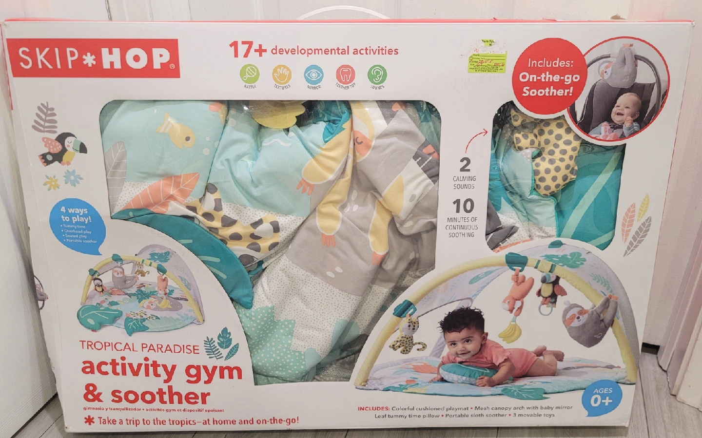 10Get ready for playtime with this Skip Hop Tropical Paradise Activity Gym & Soother! It offers 4 ways to play. This engaging activity gym offers 2-in-1 versatility. It has 17+ developmental activities