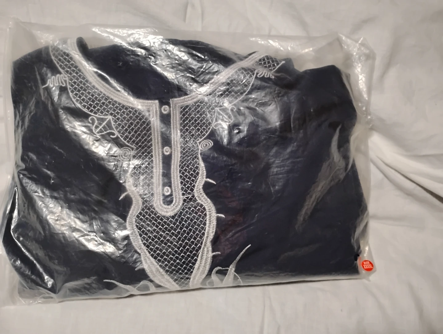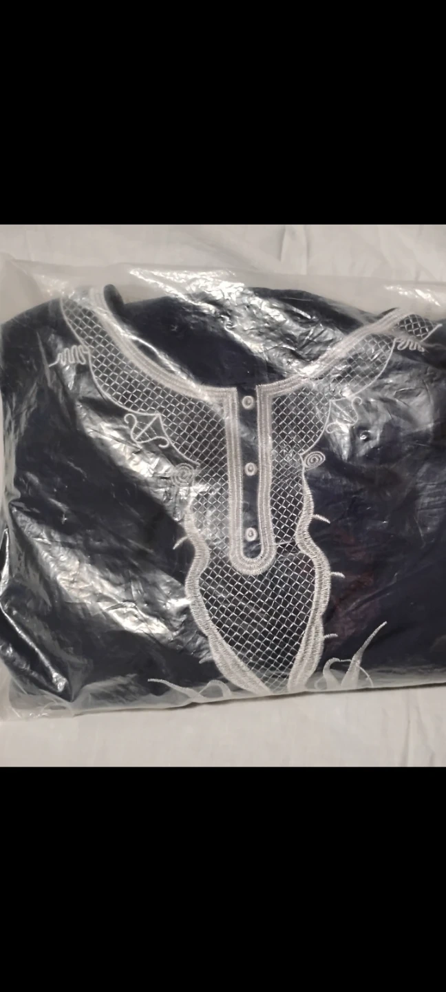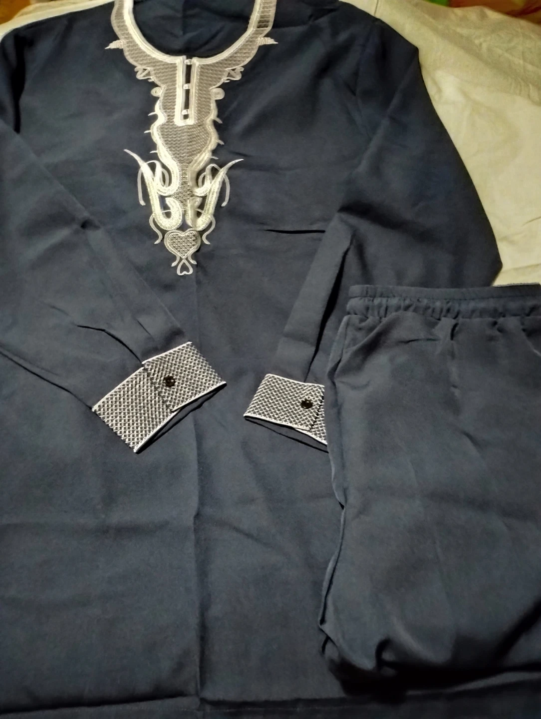 A stylish two-piece set featuring a dark blue embroidered dashiki tunic and matching pants. This outfit has intricate silver embroidery on the neckline and cuffs. It's ideal for cultural events or casual wear.