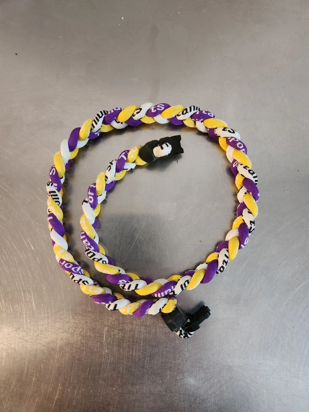 Braided necklace featuring purple, yellow, and white colours. It has a secure black plastic clasp. This necklace is perfect for athletes or anyone looking for a casual accessory.