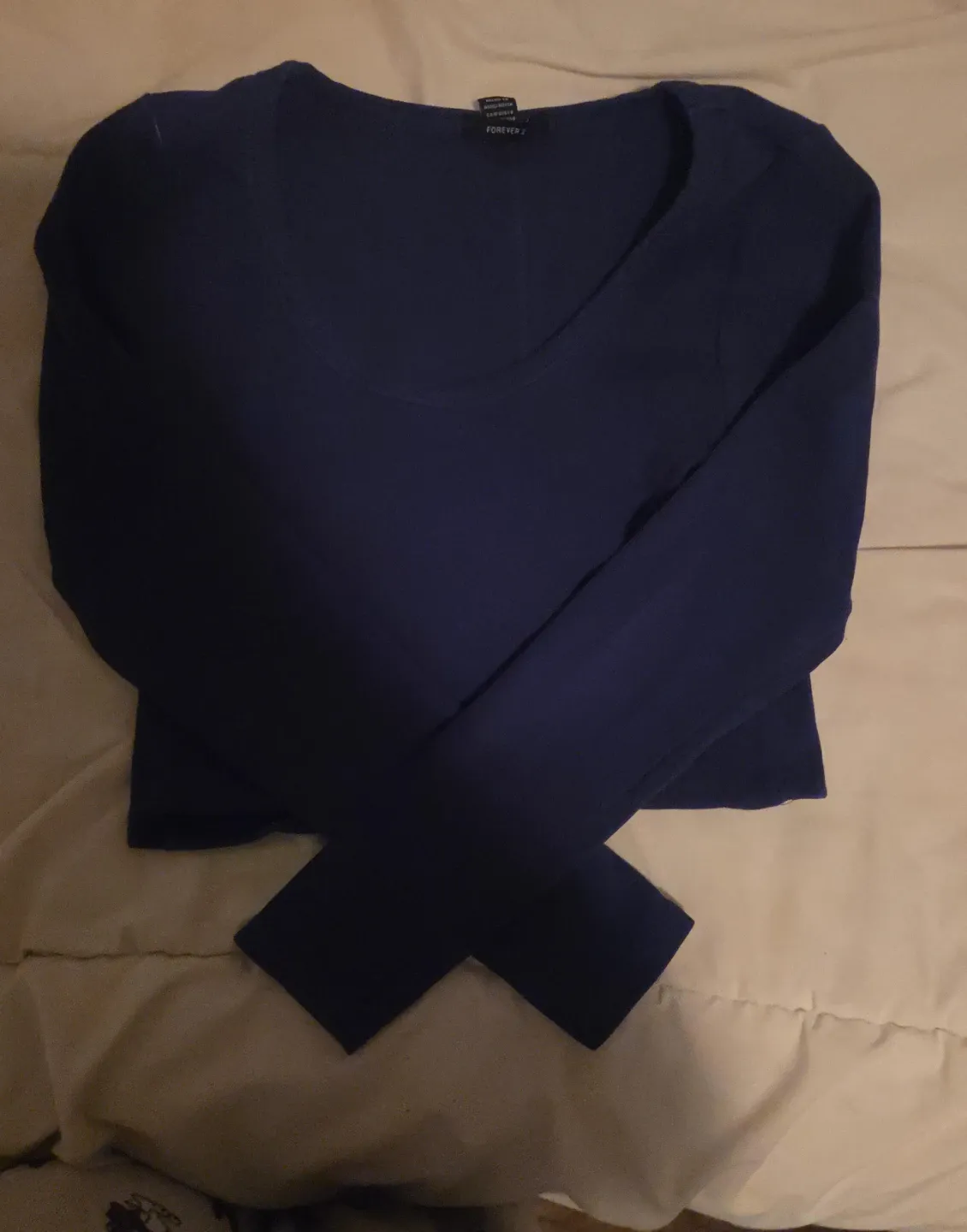 This is a blue long-sleeved top from Forever 21. It's a size large. The material is soft and stretchy.
