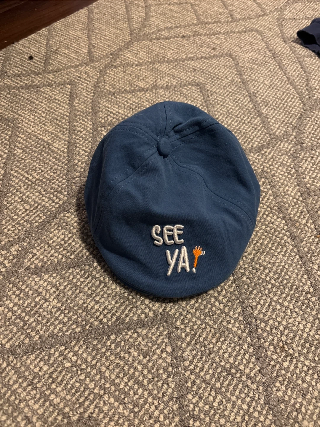 This is a blue hat with 'See Ya!' embroidered on it. It's a flat cap style. Great for kids who are heading off!