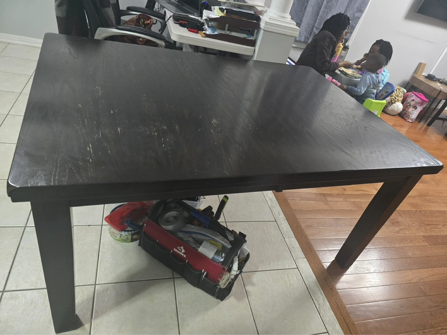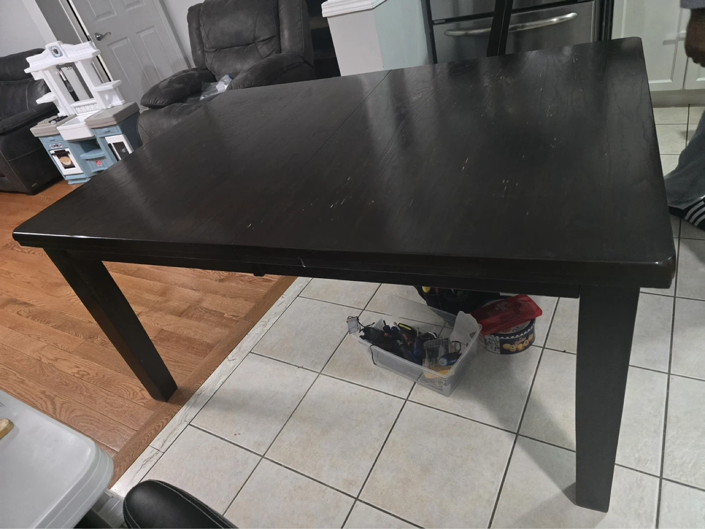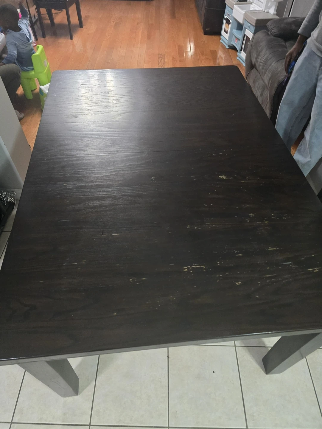 This is a dark wood dining table. It features a sturdy build with four legs. Its rich, dark finish complements many decors. Little scratches that can be concealed with a table cloth