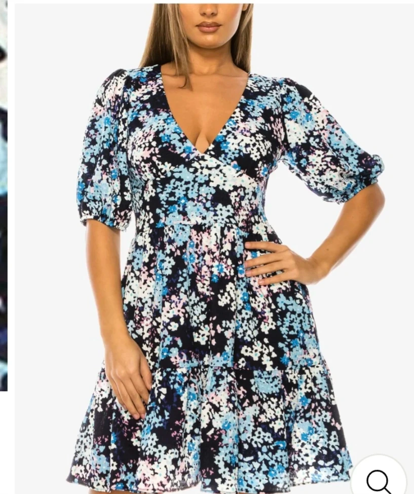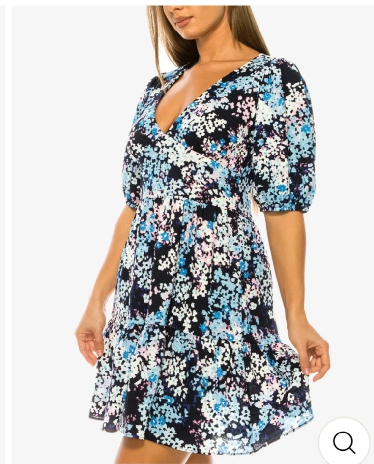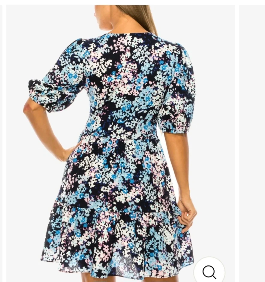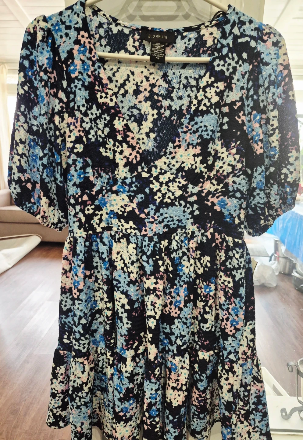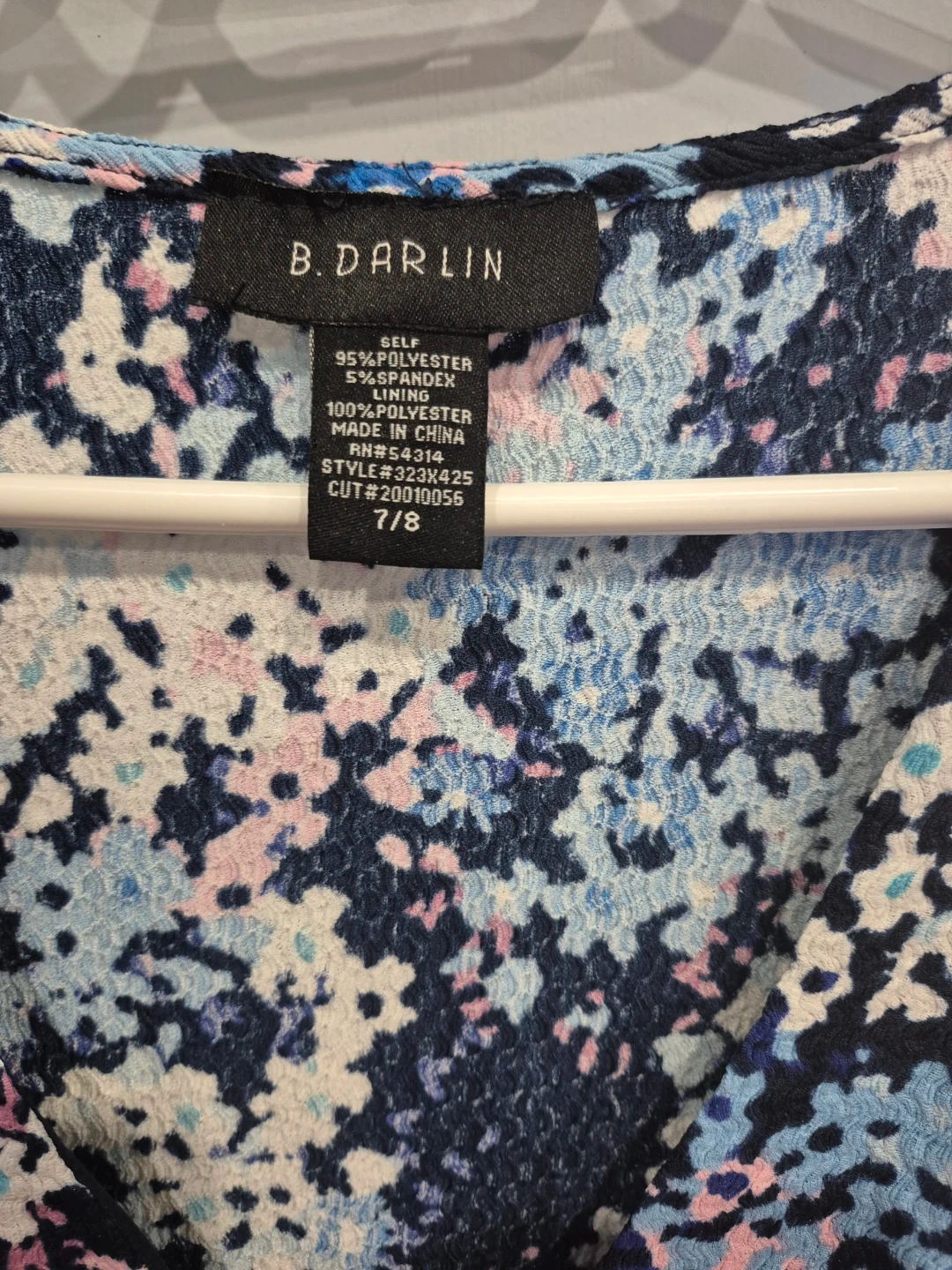 B. Darlin dress with a blue, pink, and white floral print. Self is 95% polyester and 5% spandex. Lining is 100% polyester. It's a size 7/8.
