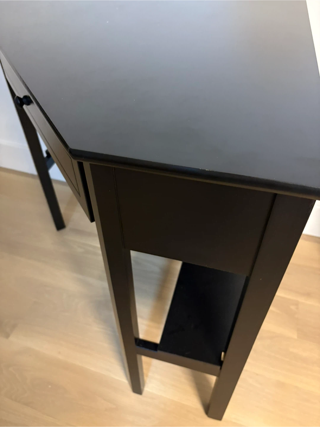 Black corner desk with a drawer.