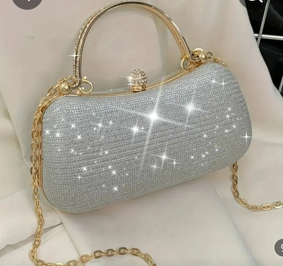 A dazzling silver clutch with a sparkly glitter finish. It features a secure clasp closure and a detachable gold-tone chain strap for versatile wear. Its structured, rectangular shape makes it perfect for holding essentials.