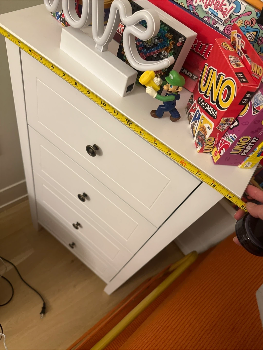 This white dresser features four drawers for storage. Dimensions are approximately 19.5 inches wide, 15.8 inches deep, and 37.6 inches tall. It's made of a wood composite material.