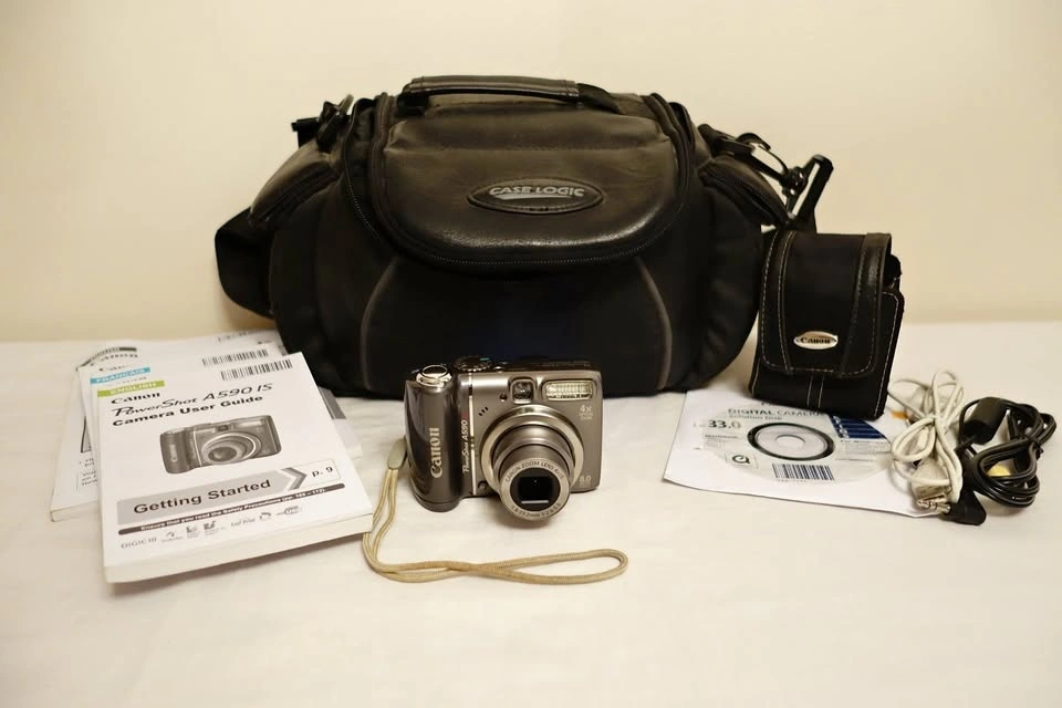 Offering a vintage Canon PowerShot A590 IS 8MP digital camera, popular with retro photography enthusiasts. This unit is in excellent condition and includes English and French instruction manuals, Canon software CD, USB transfer cable, audio/video cables, an original Canon travel case, and a Case Logic camera case. Everything on the camera functions perfectly. The battery door closes properly with no gaps, and there are no signs of battery leakage in the compartment. There are a few minor cosmetic imperfections at the bottom, but no cracks or significant damage. Additional pictures are available upon request. A brand new memory card and a set of batteries are included to get you started. Feel free to message if you have any questions!