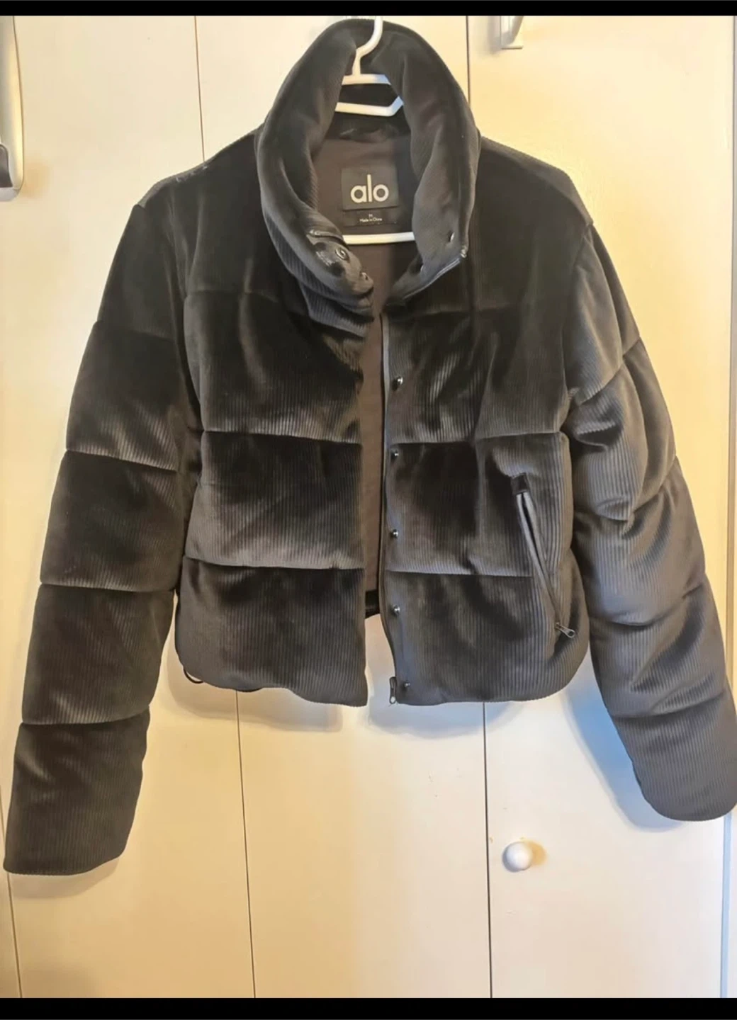 Alo jacket in ribbed velour. It's a size medium.. This puffer jacket offers a stylish and cozy feel.