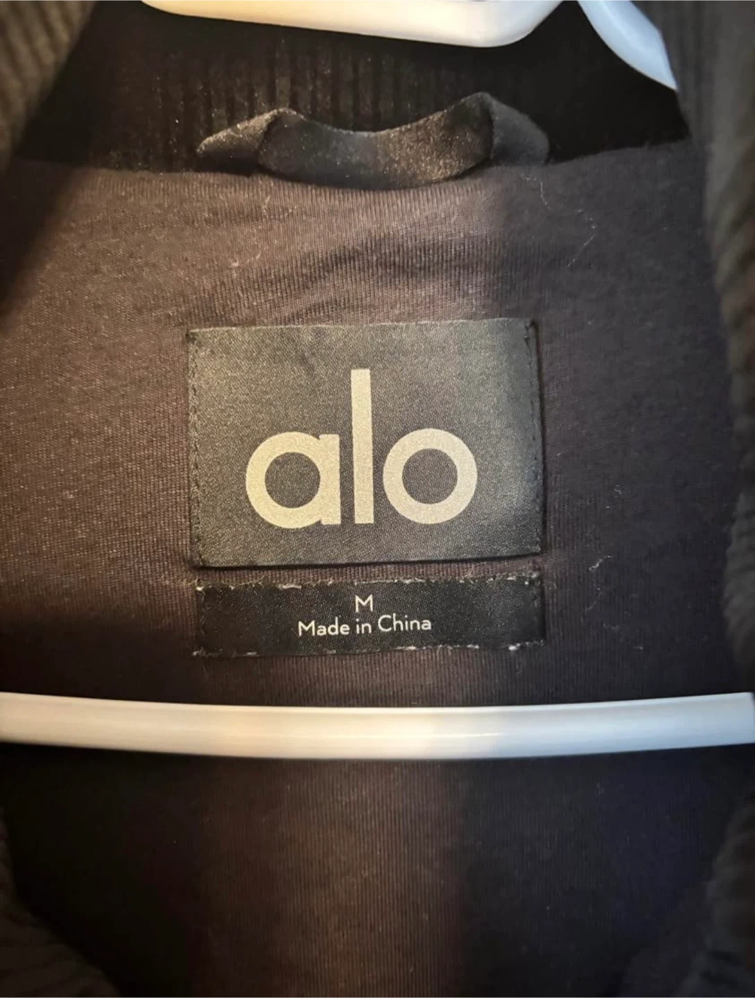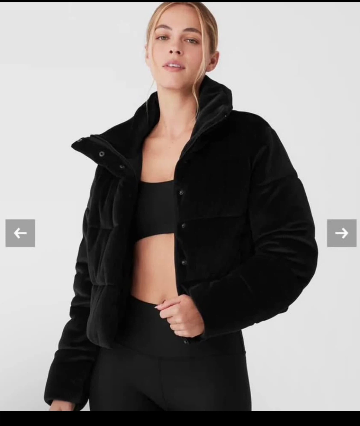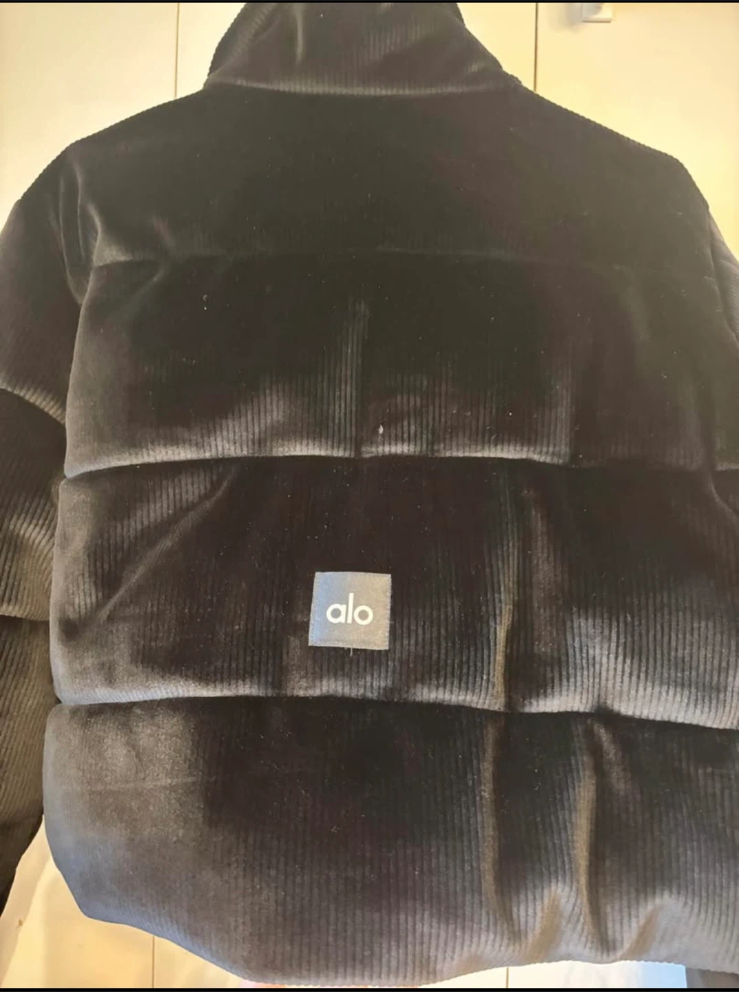 Alo jacket in ribbed velour. It's a size medium.. This puffer jacket offers a stylish and cozy feel.