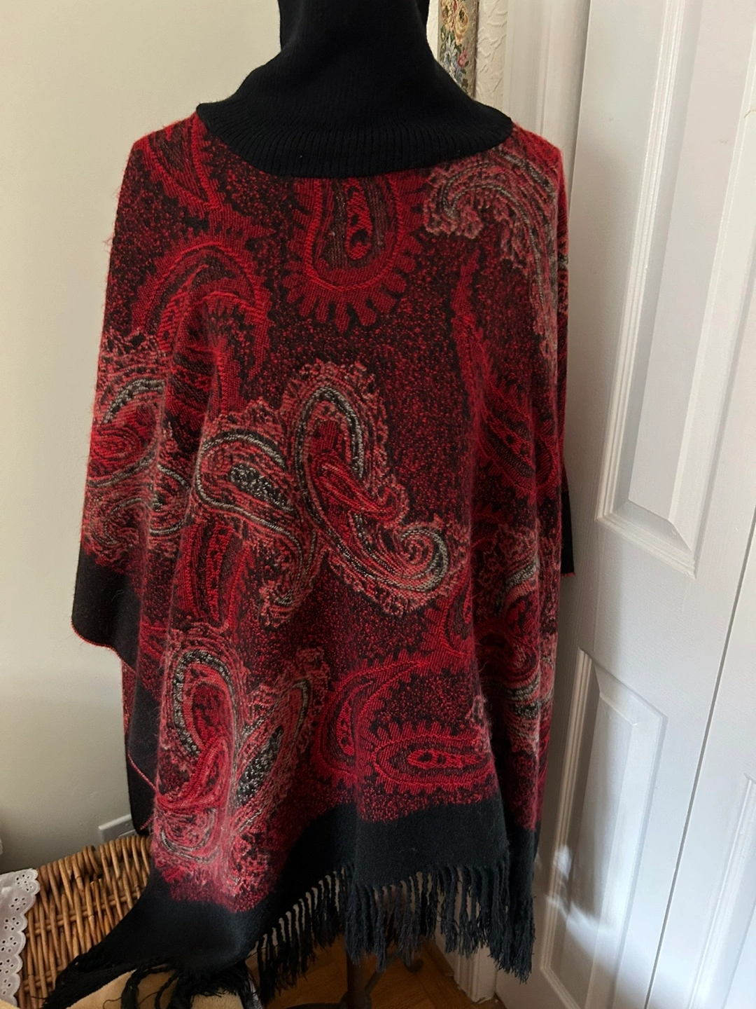 Warm and cozy poncho, features a red and black paisley pattern. Black turtleneck collar. Fringed edges. Soft material.