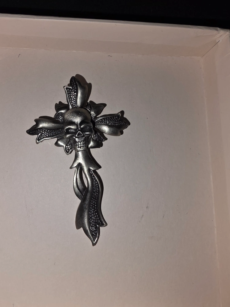 10Here's a cool skull and flower cross pendant! It's made of metal and has a unique design. It's in great condition and would be a great addition to any collection