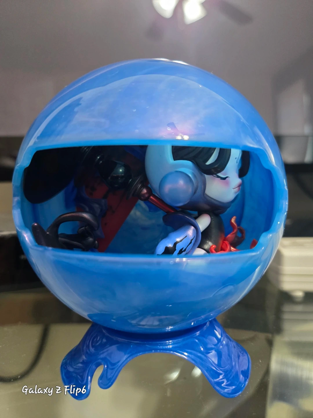10Selling a cute blue figurine inside a sphere. It's in great condition and would look great on a shelf or desk!