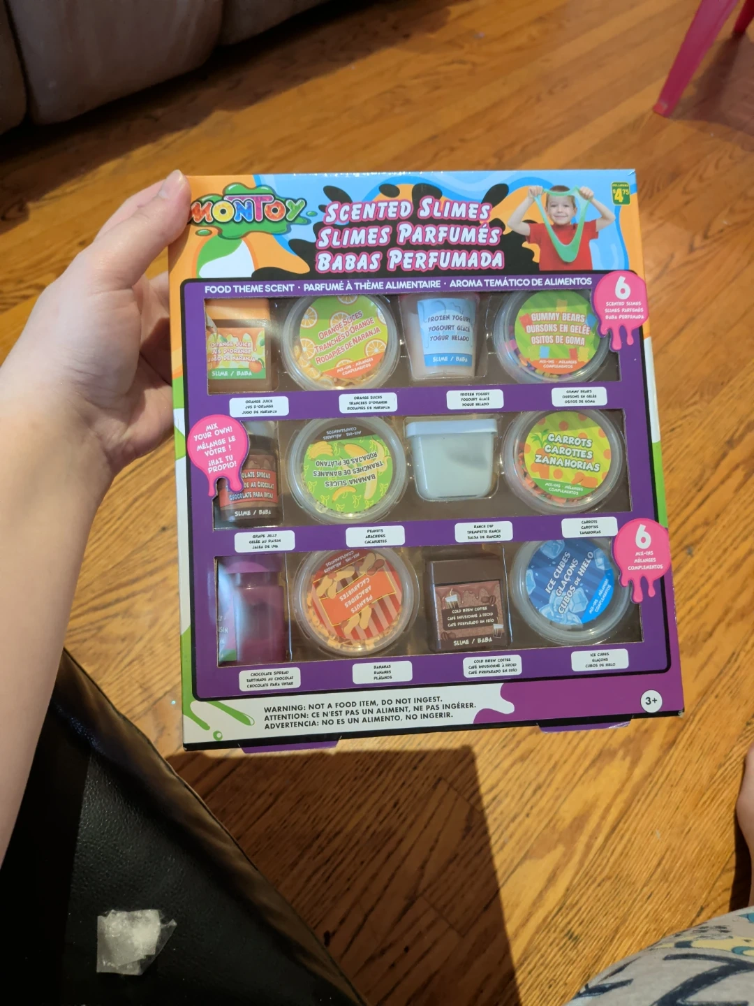 This Montoy set includes six scented slimes with a food theme. Scents include orange juice, orange slices, frozen yogurt, gummy bears, chocolate spread, and bananas. It also comes with ice cubes slime and two mix-ins.