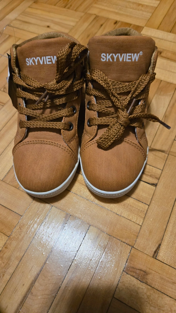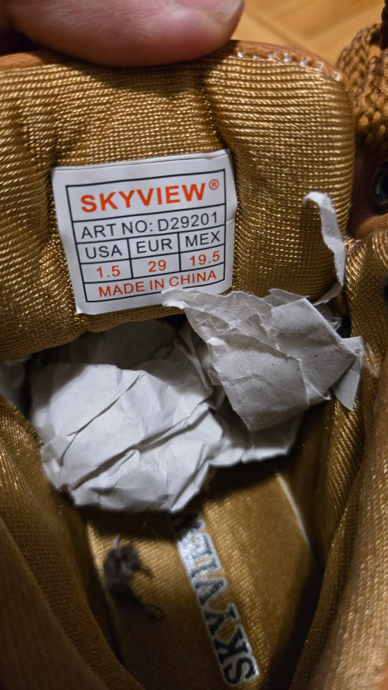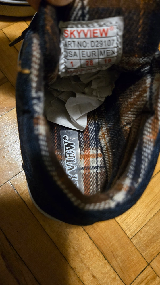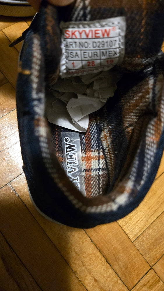 These Skyview kids' shoes are in great shape and ready for a new home! They feature a stylish blue denim exterior and a comfortable plaid interior. The size is marked as 1 (USA), 28 (EUR), and 19 (MEX).