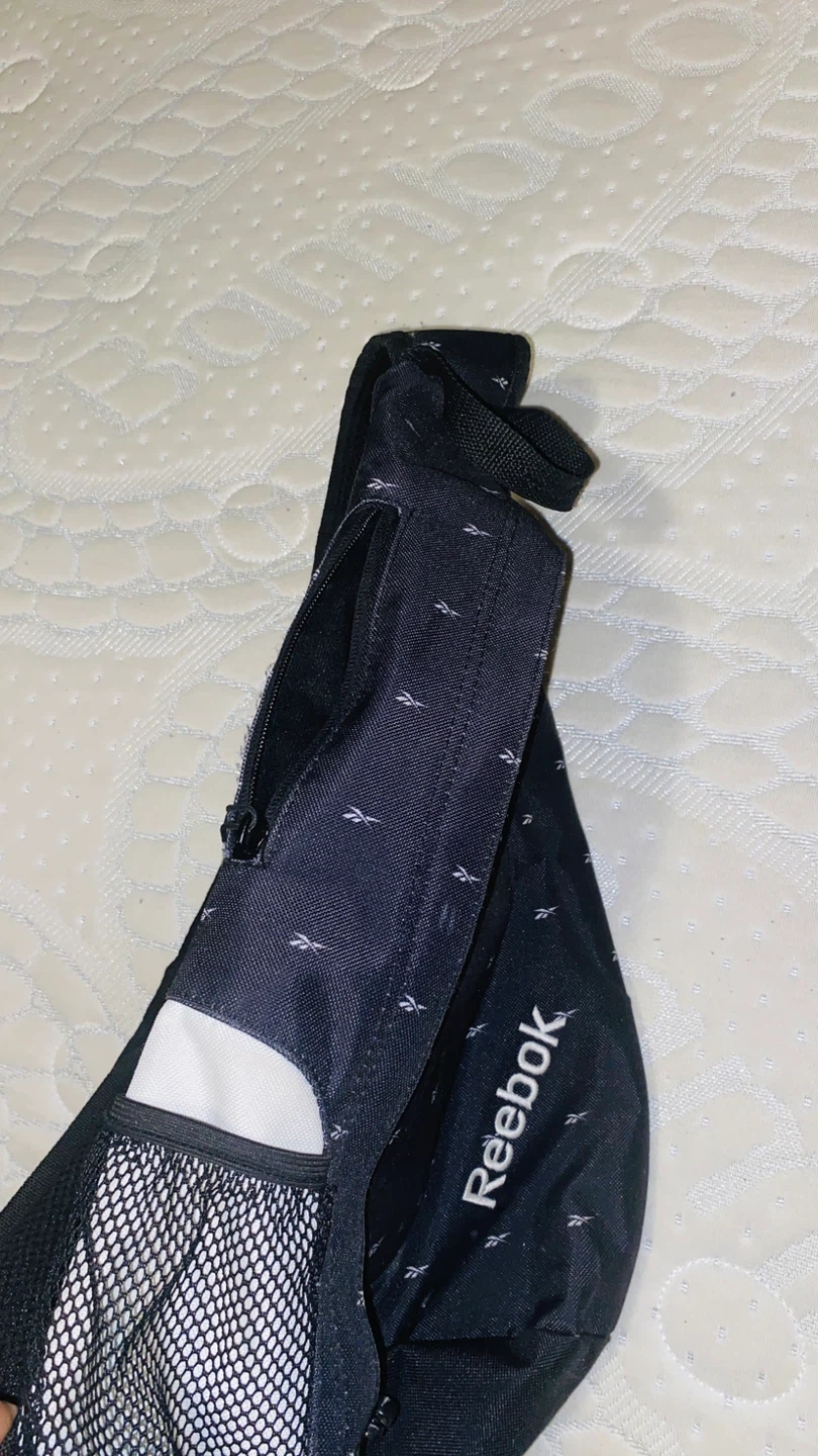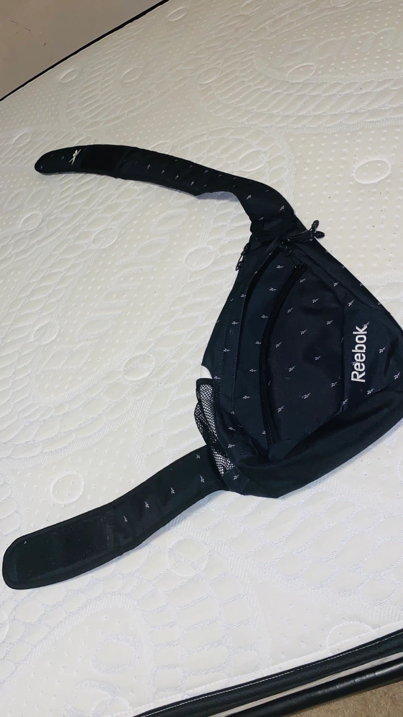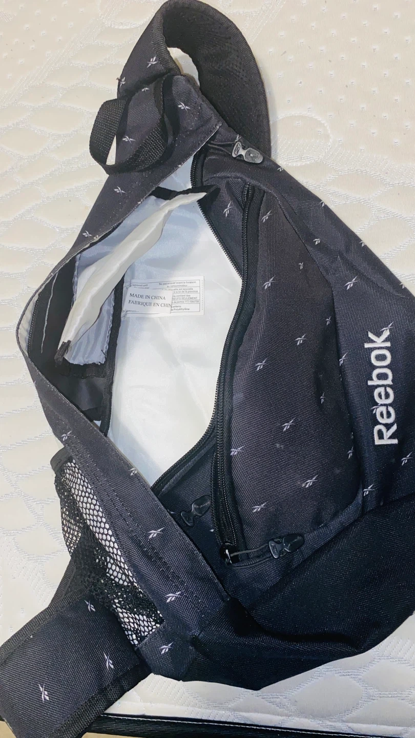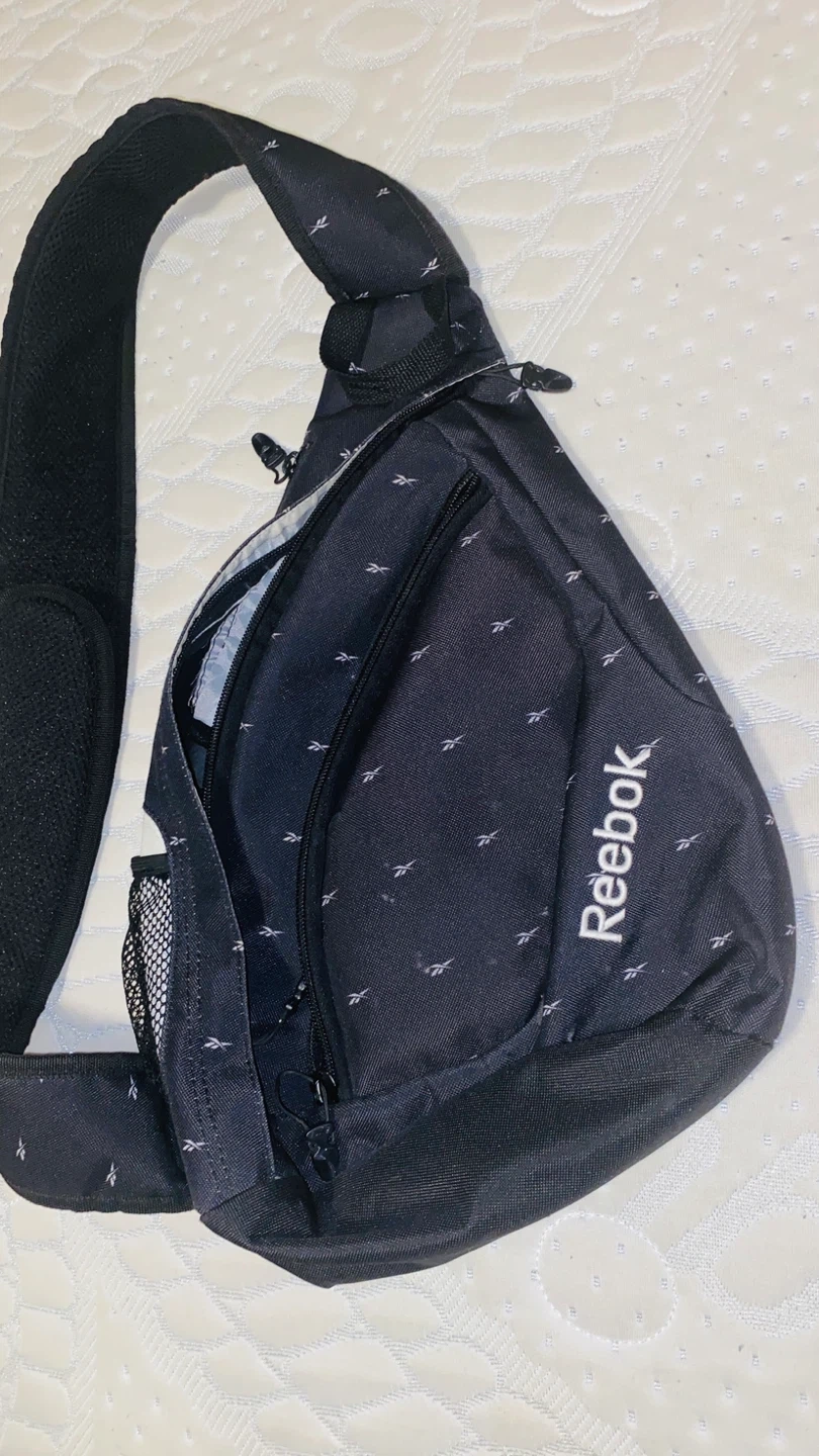 Reebok sling bag in black with a repeating small logo pattern. It features a mesh pocket on the side and multiple zippered compartments. Adjustable strap for comfortable wear. Bought for my son, but Never Used. Exactly as new.