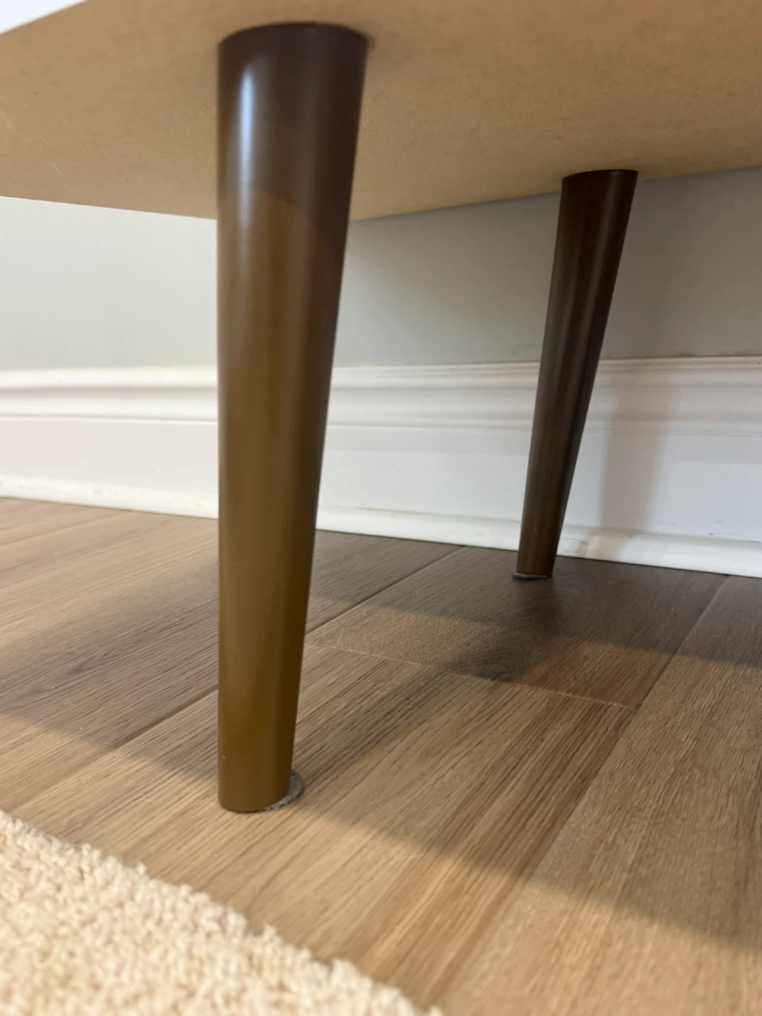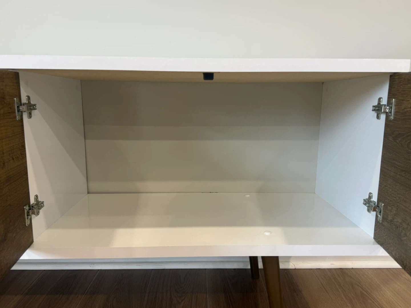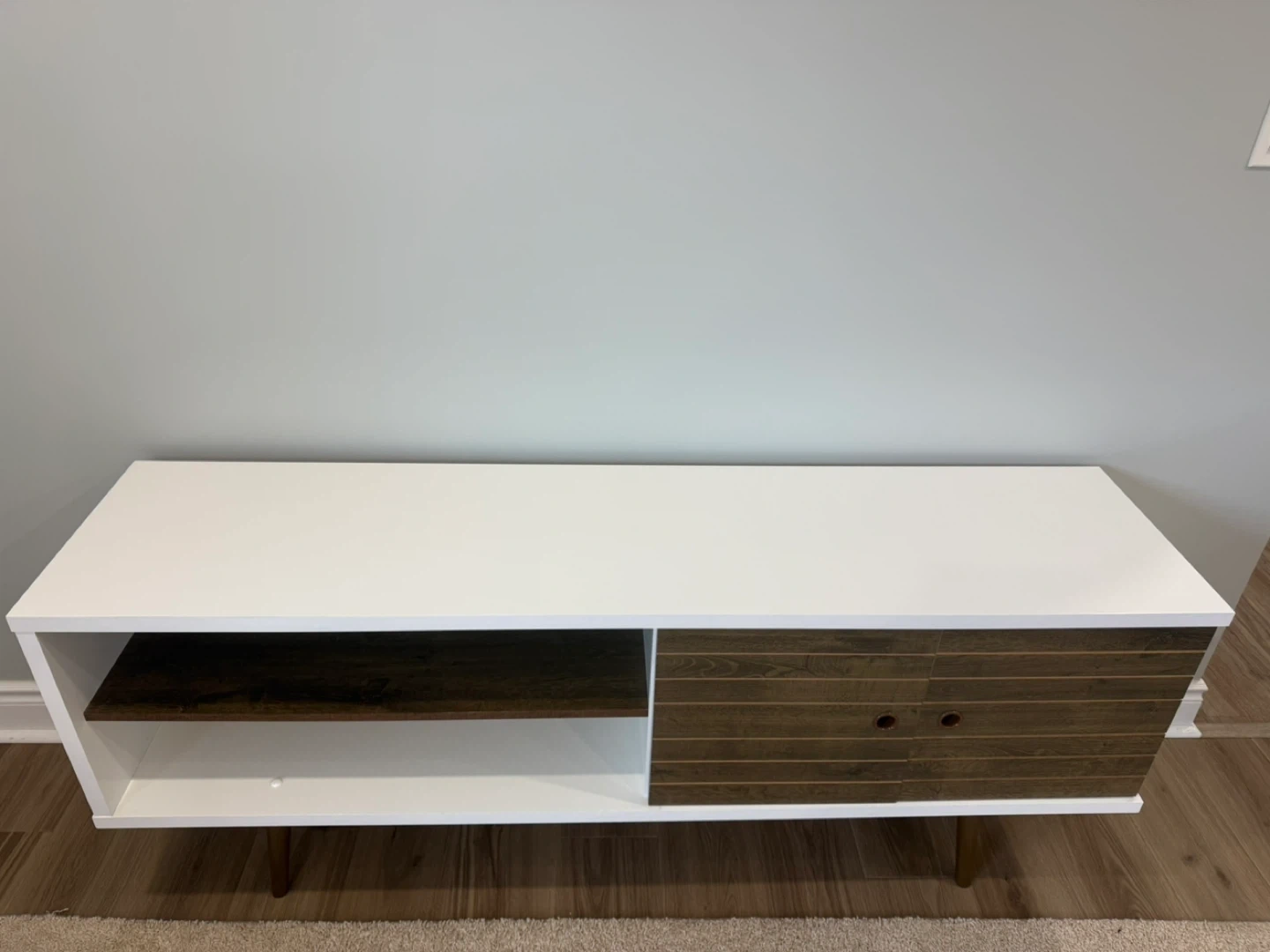 This media console features a clean white finish with contrasting wood-look accents. It has one open shelf and a cabinet with a door. Tapered wooden legs give it a mid-century modern feel. It's perfect for organizing your entertainment space!