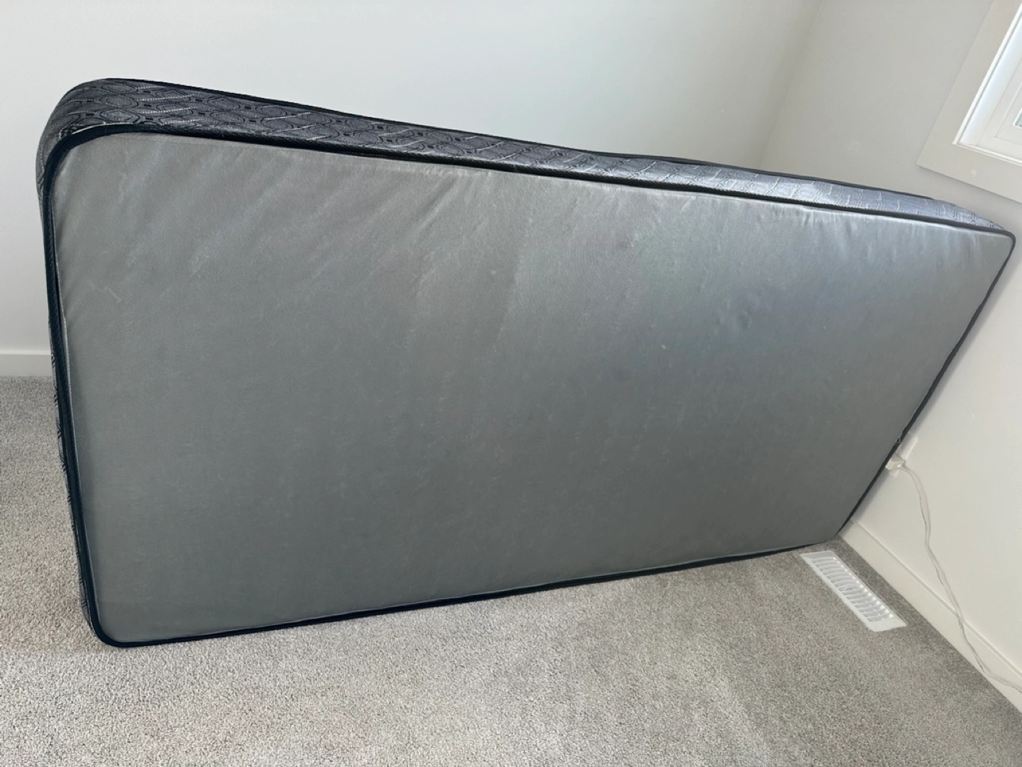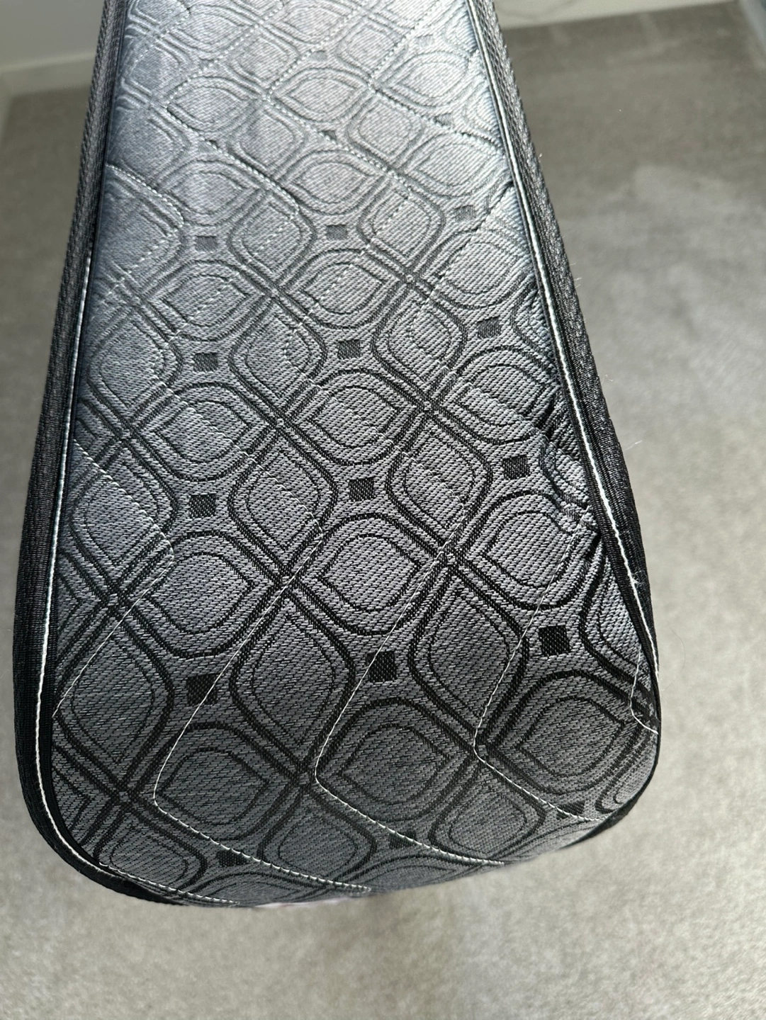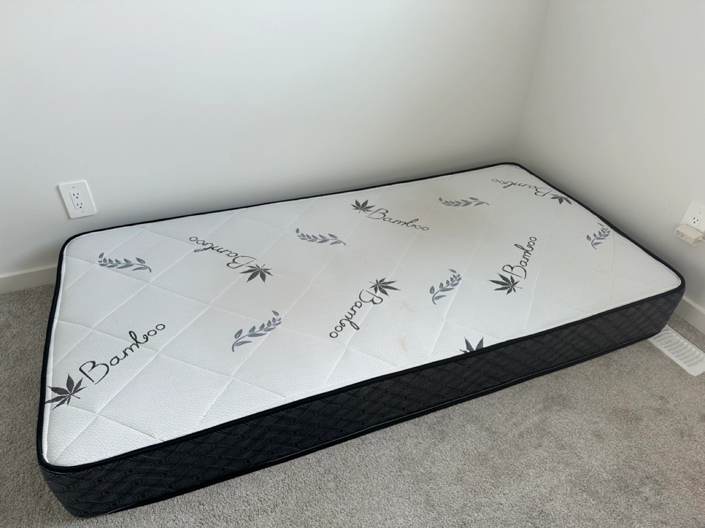 14Single mattress with a grey and black quilted fabric and a bamboo print on the top. The mattress is orthopedic and includes a tag on the side that says "Sleep In Mattress".
