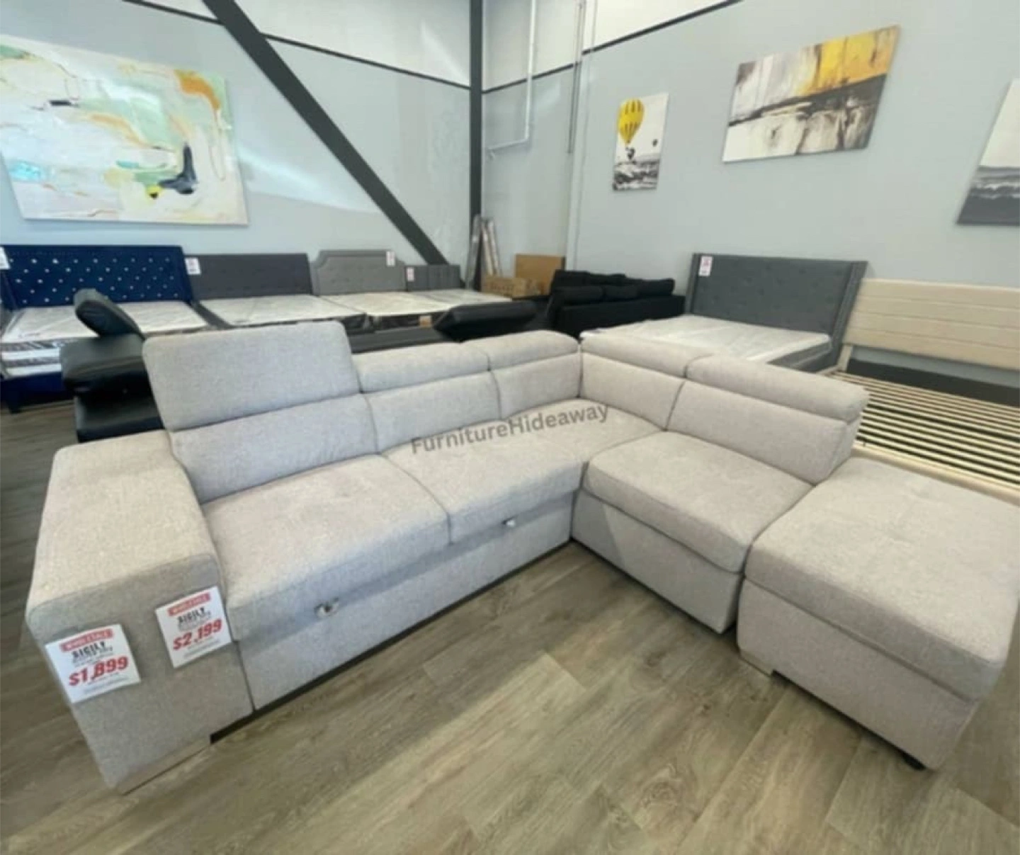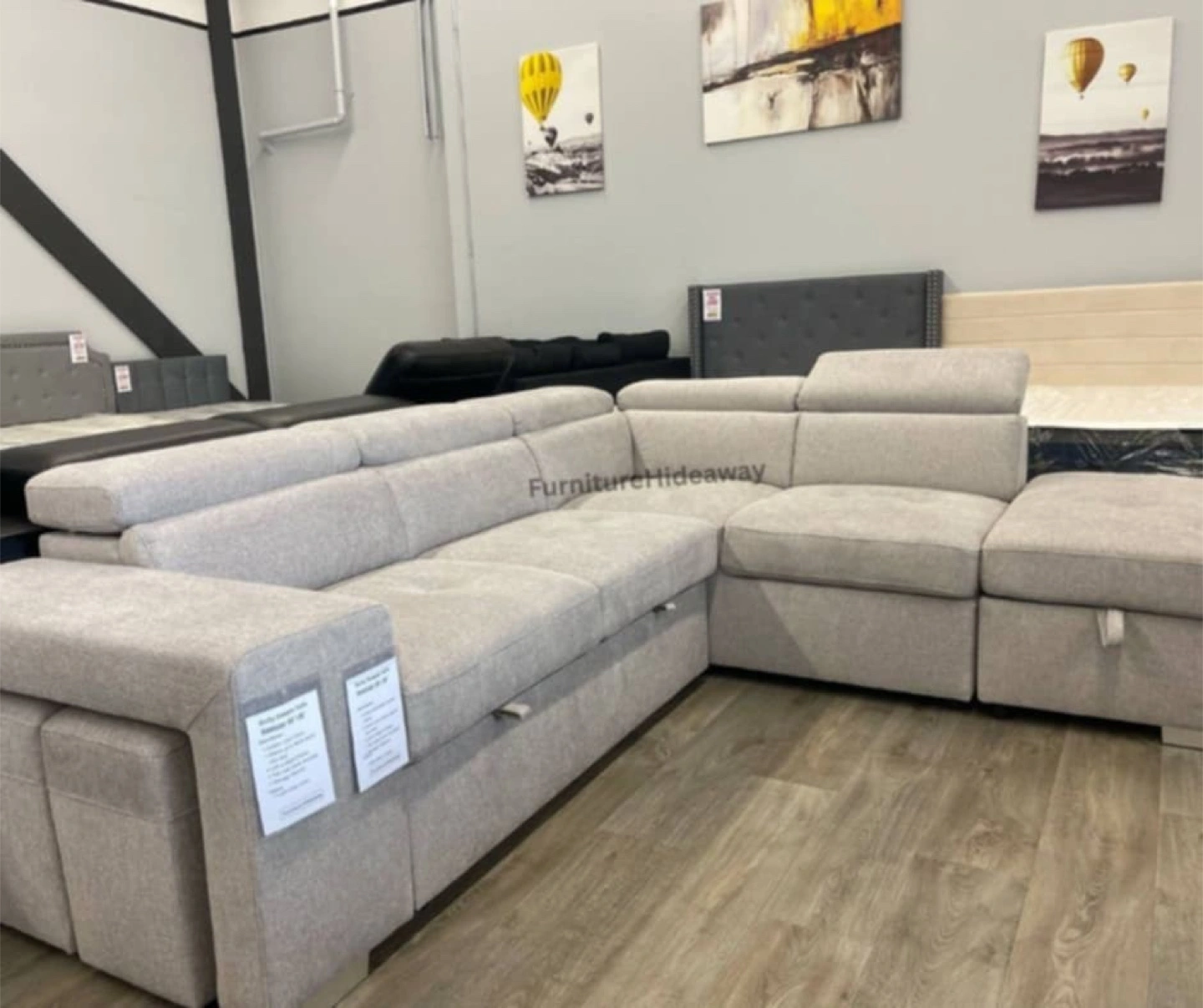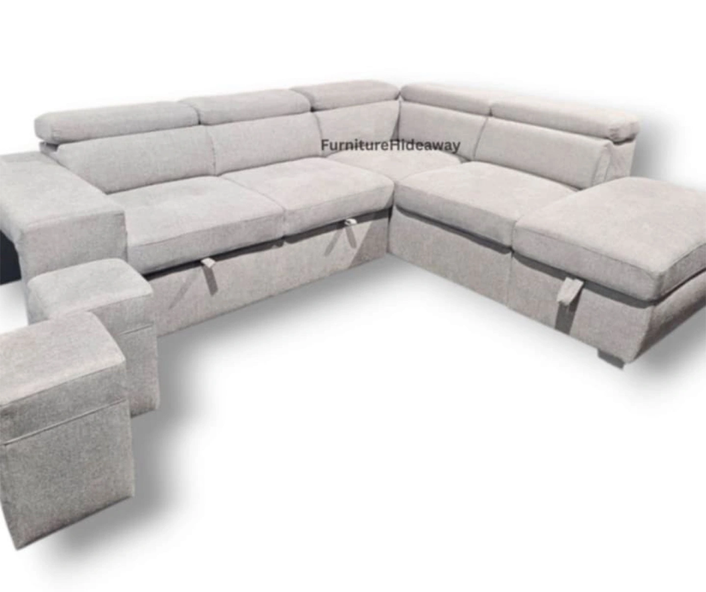 20Experience comfort and style with the Sicily sectional! Made with soft cotton-linen fabric, it features adjustable headrests, left or right facing setup, two side stools, and a storage ottoman. Easily converts into a queen-size bed. Sale Price: $1,799 📌206-314 Wale Rd