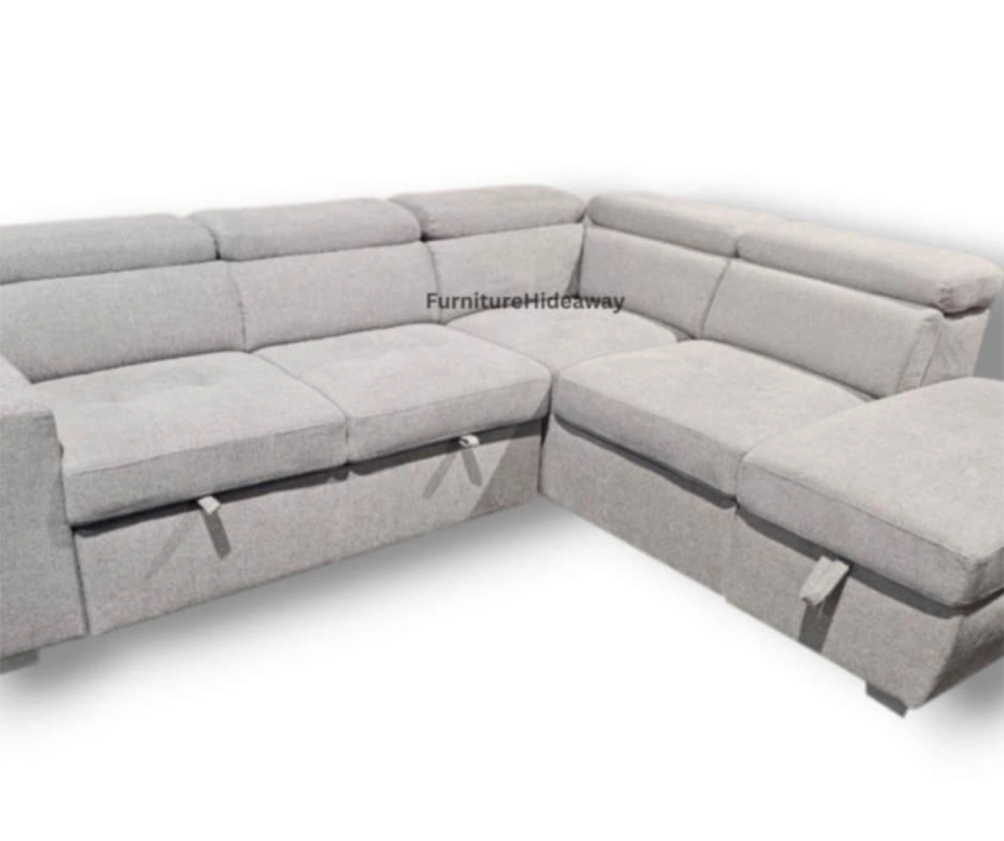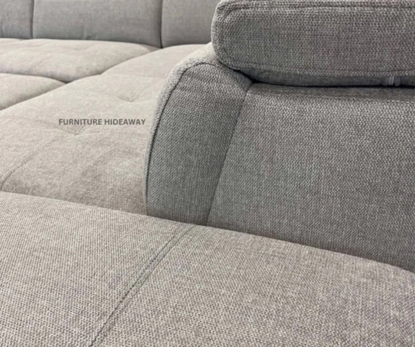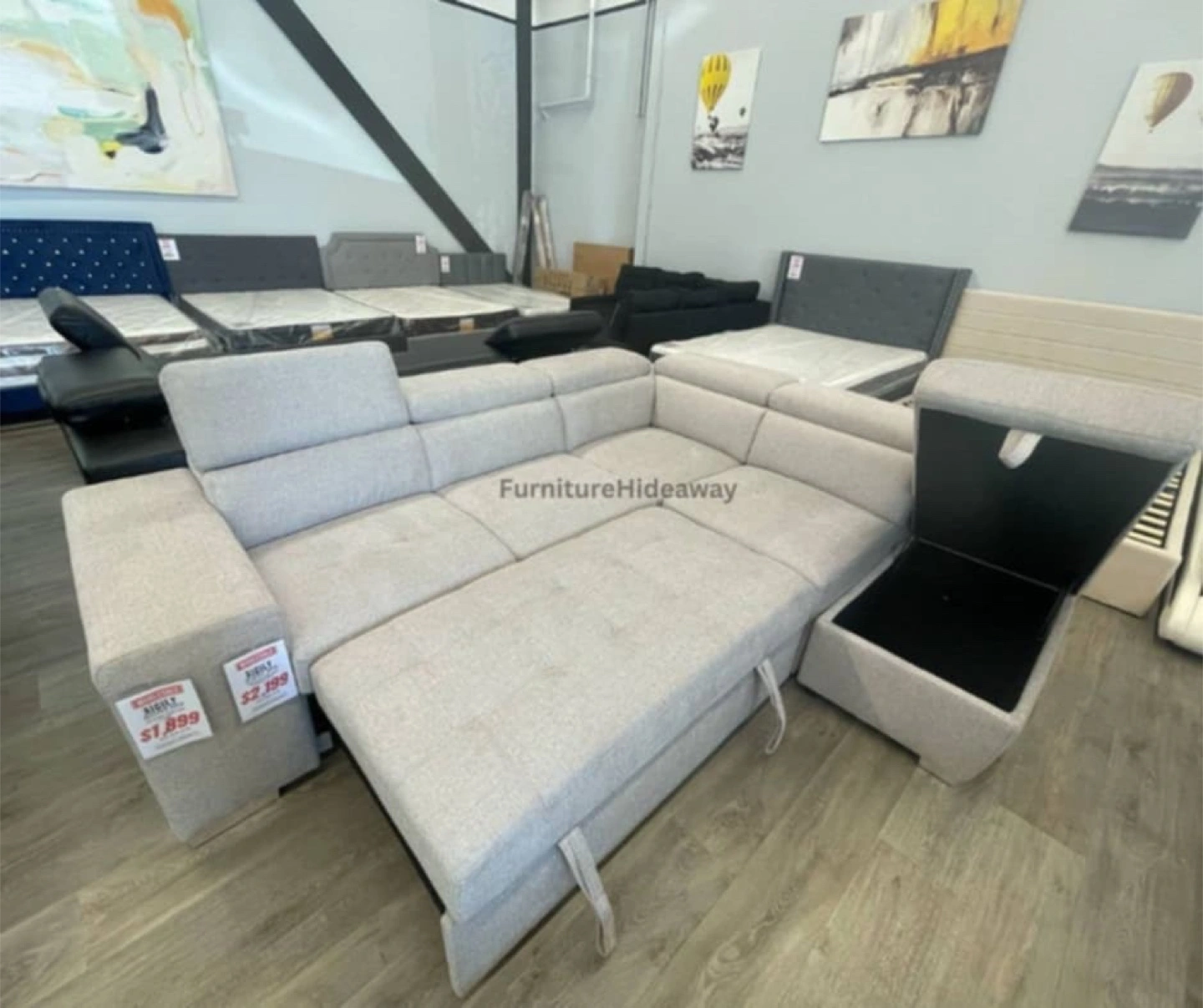 20Experience comfort and style with the Sicily sectional! Made with soft cotton-linen fabric, it features adjustable headrests, left or right facing setup, two side stools, and a storage ottoman. Easily converts into a queen-size bed. Sale Price: $1,799 📌206-314 Wale Rd