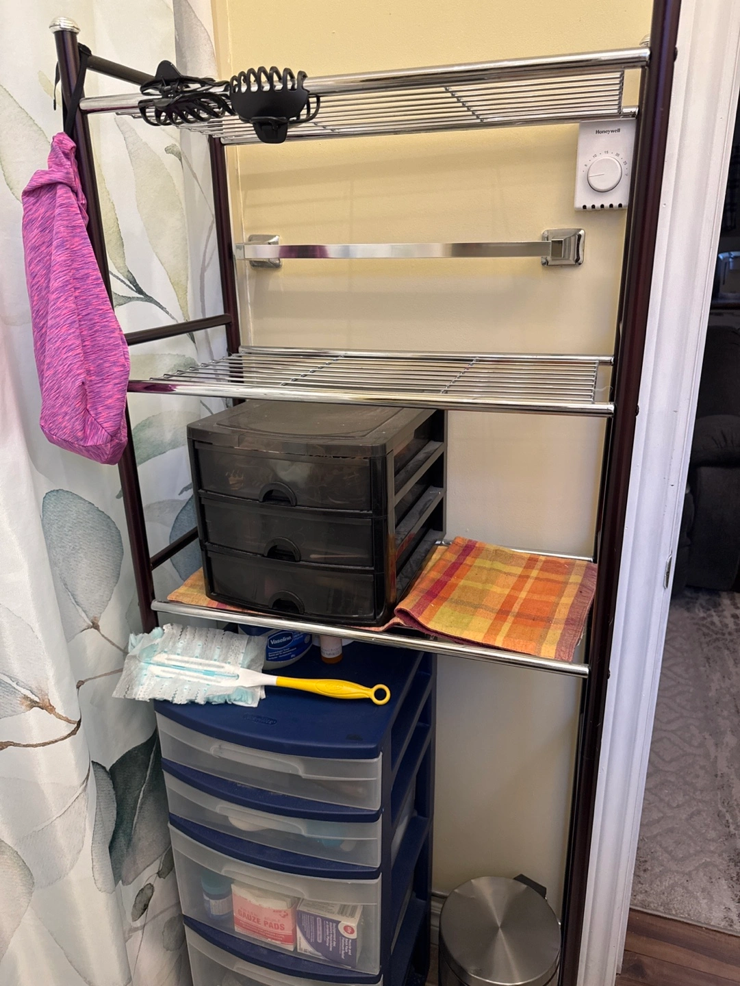 Multi-tiered storage unit. Chrome shelving and dark brown frame. Includes hanging rod. Great for small spaces. Items on the stand at the moment are not included. Just the stand.
