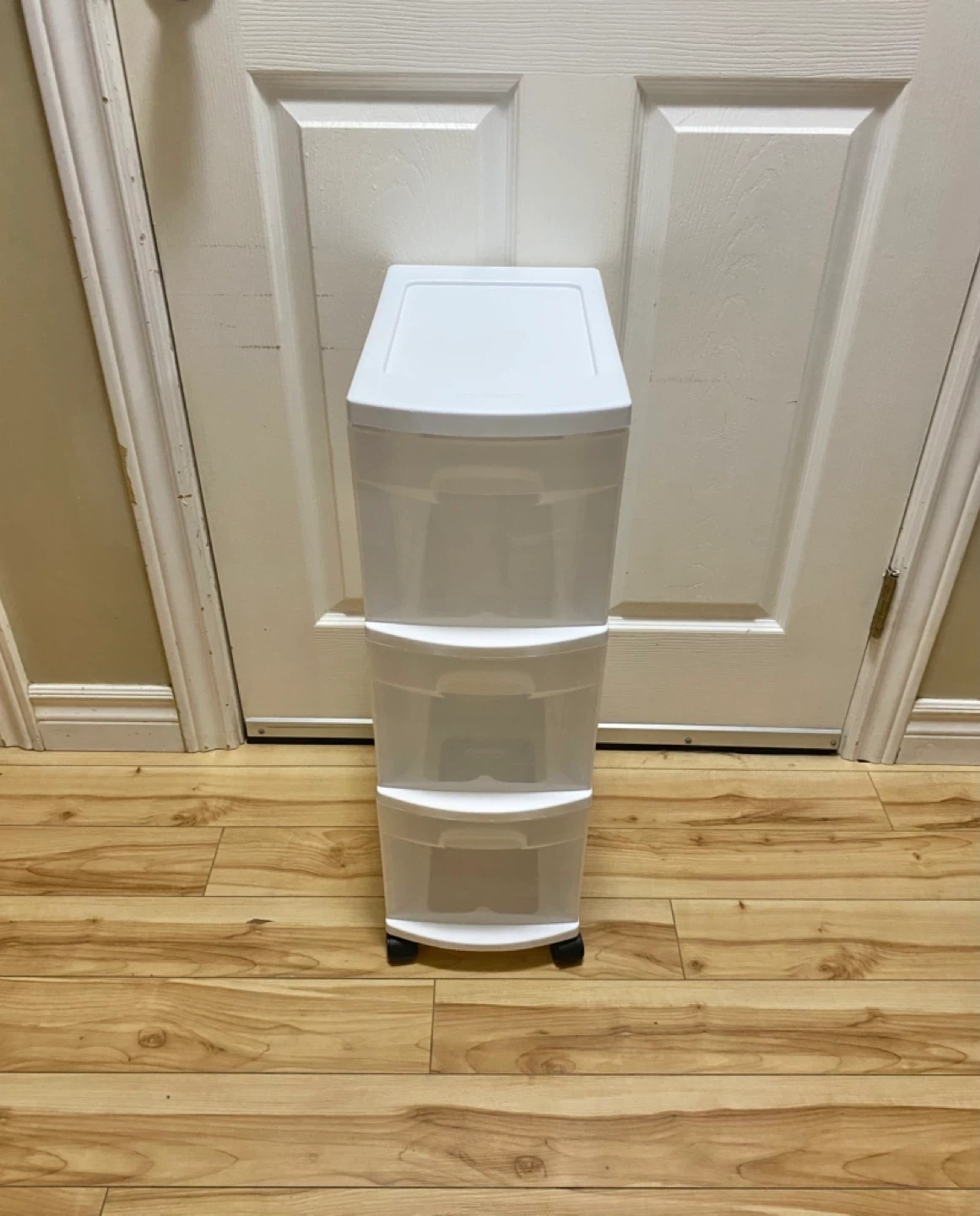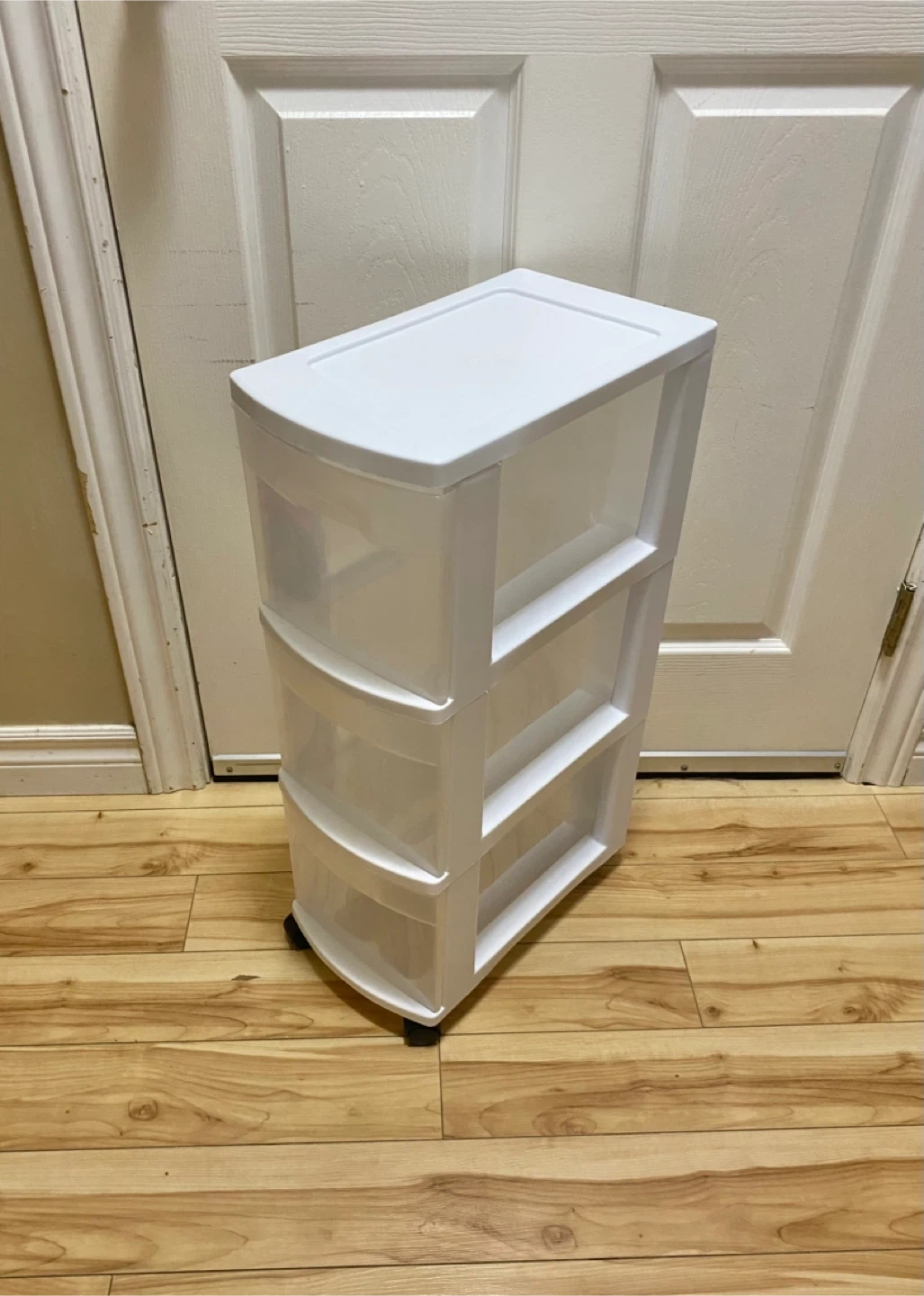 73• 14.3L x 8.3”W x 25.5”H • white plastic frame • 3 clear drawers • 4 wheels Clean … excellent condition… price firm