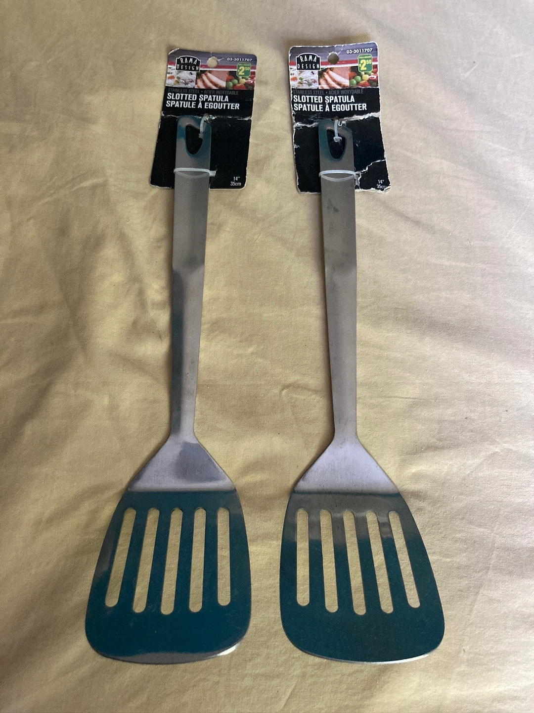 933Selling 2 slotted spatulas! They're made of stainless steel and are 14 inches (35cm) long. Originally cost $2.50 each. Take both for $3!
