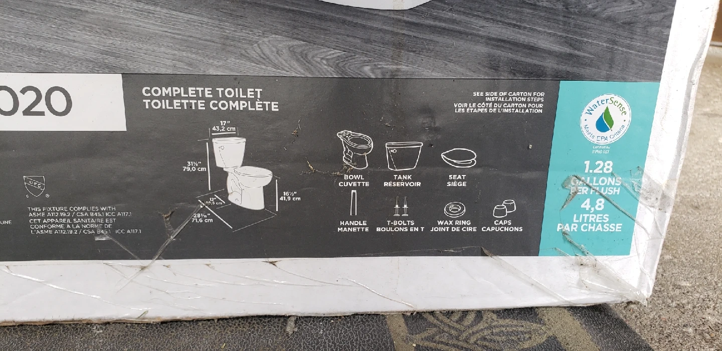 Selling a brand new in box American Standard Edgemere toilet! It's a round front toilet in white. This is a beautifully elegant collection that's easy to install. The dimensions are 28 3/16" L x 17" W x 31 1/8" H