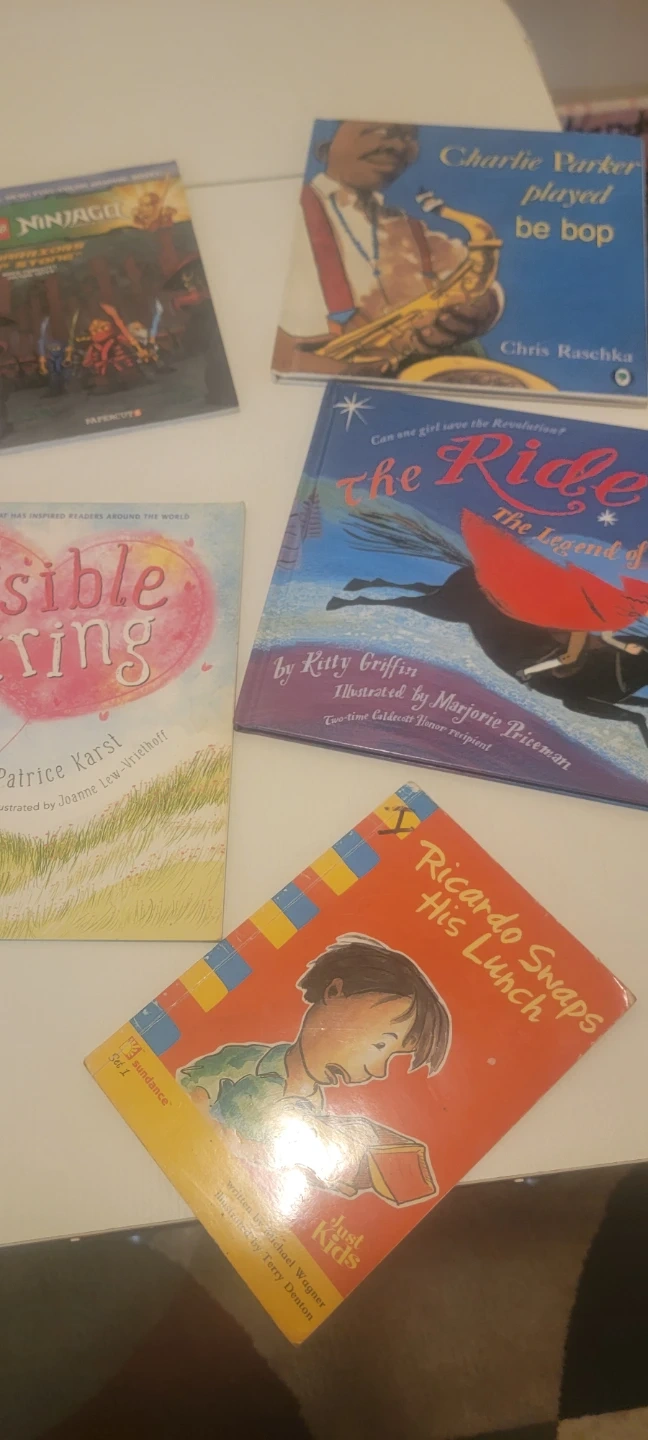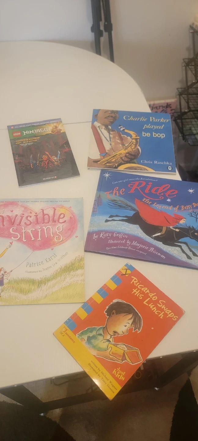 This bundle includes five children's books. Titles are LEGO Ninjago: Warriors of Stone, Charlie Parker Played Be Bop, The Invisible String, The Ride: The Legend of Betsy Dowdy, and Ricardo Swaps His Lunch. Books are suitable for young readers.