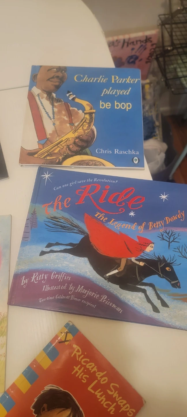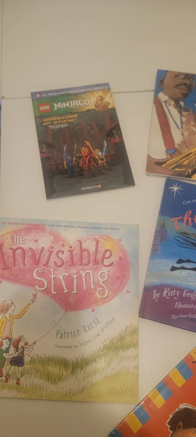 This bundle includes five children's books. Titles are LEGO Ninjago: Warriors of Stone, Charlie Parker Played Be Bop, The Invisible String, The Ride: The Legend of Betsy Dowdy, and Ricardo Swaps His Lunch. Books are suitable for young readers.