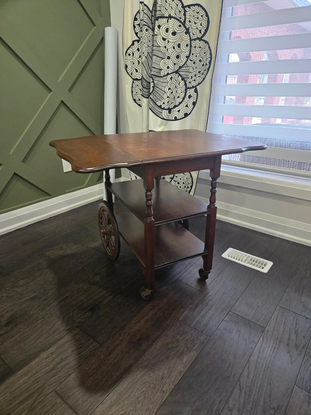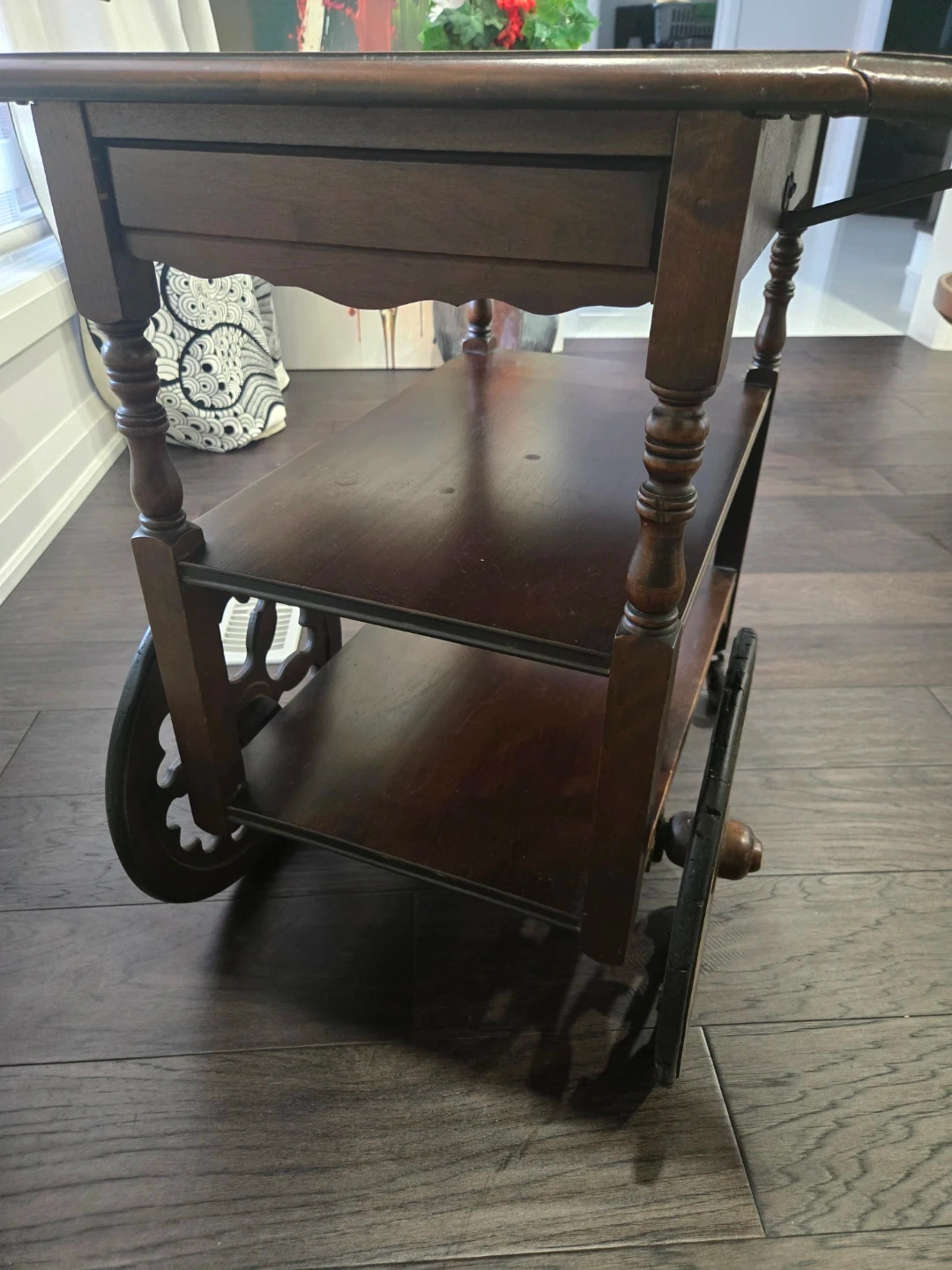 This wooden serving cart has drop-leaf sides for extra surface space when needed. It features two shelves and decorative wheels. The wood has a rich, dark finish.