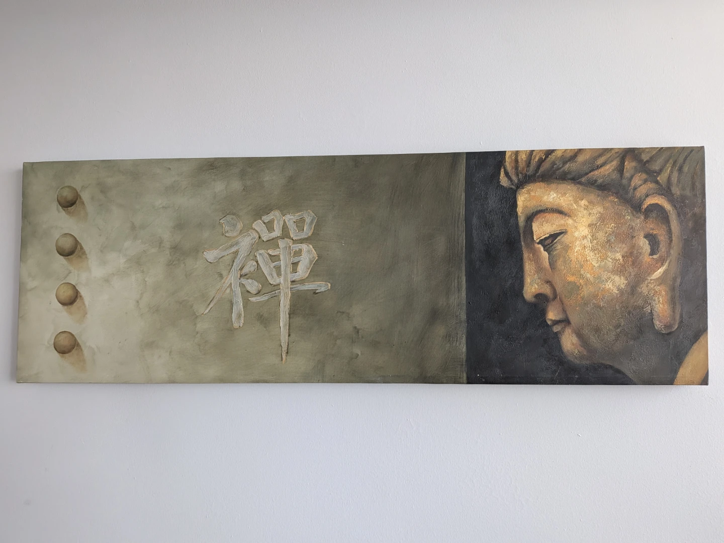 This is a lovely Zen-themed wall art piece. It features a profile of Buddha with the kanji for 'Zen' painted on a textured background. Four raised circular accents add a subtle dimension to the left side.