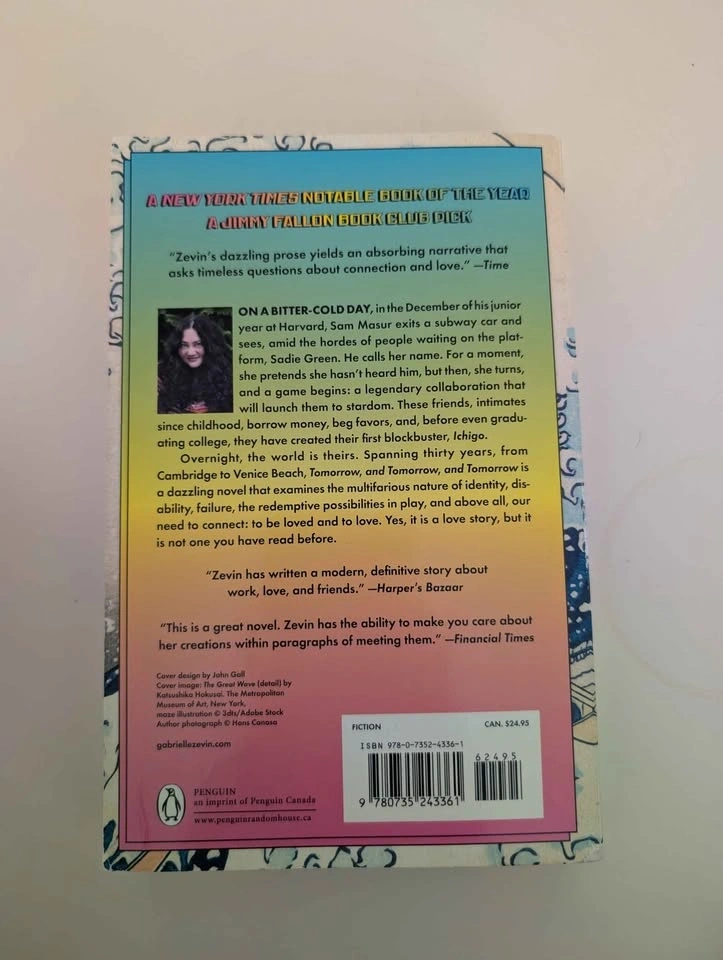 Great condition paperback copy of 'Tomorrow and Tomorrow and Tomorrow' by Gabrielle Zevin. The cover has a colorful design with a wave motif and the title is written in multicolored letters. The book is a New York Times bestseller as indicated on the cover. CASH ONLY :) Meet Up: Spadina Subway station Price is firm.