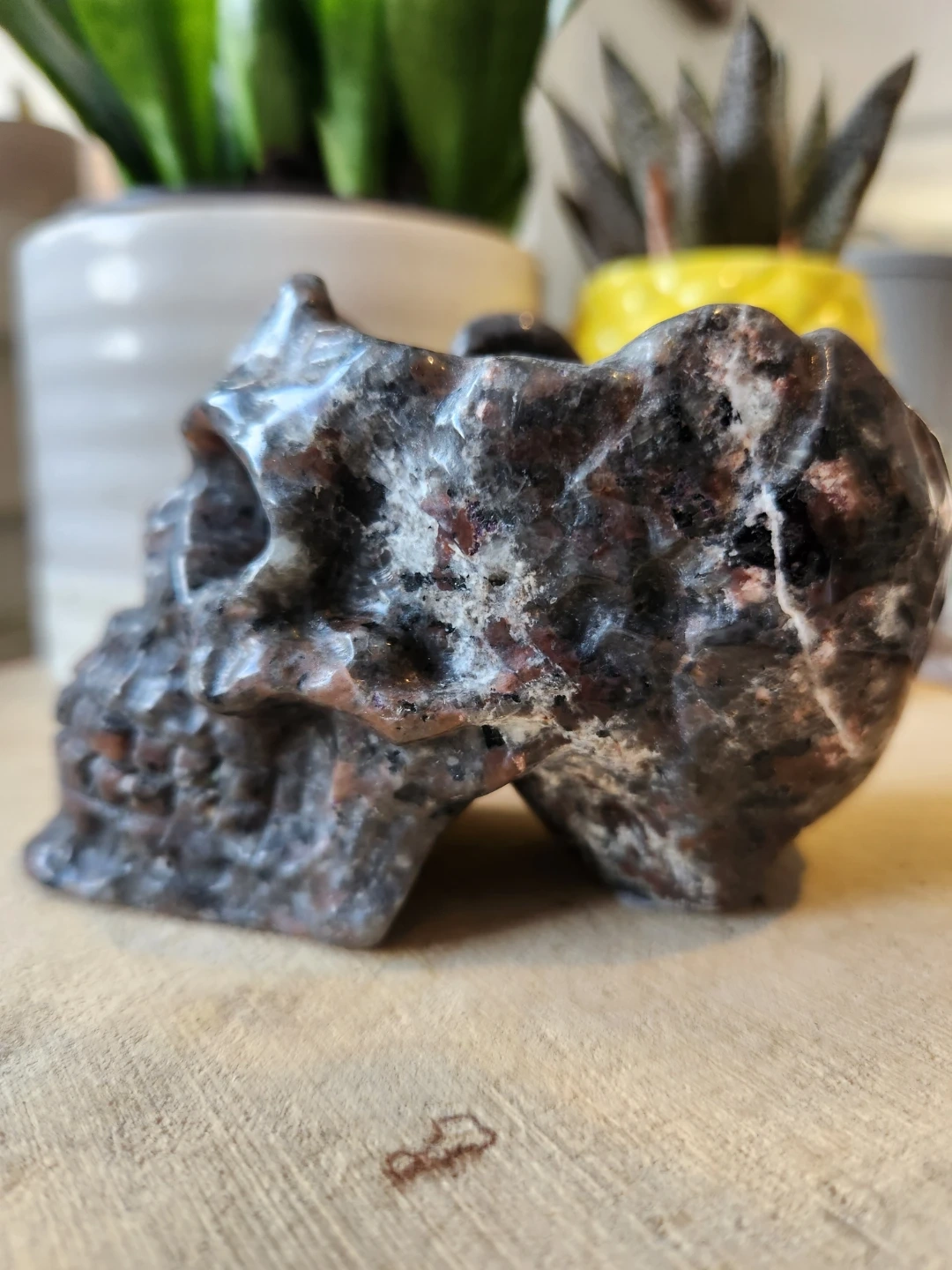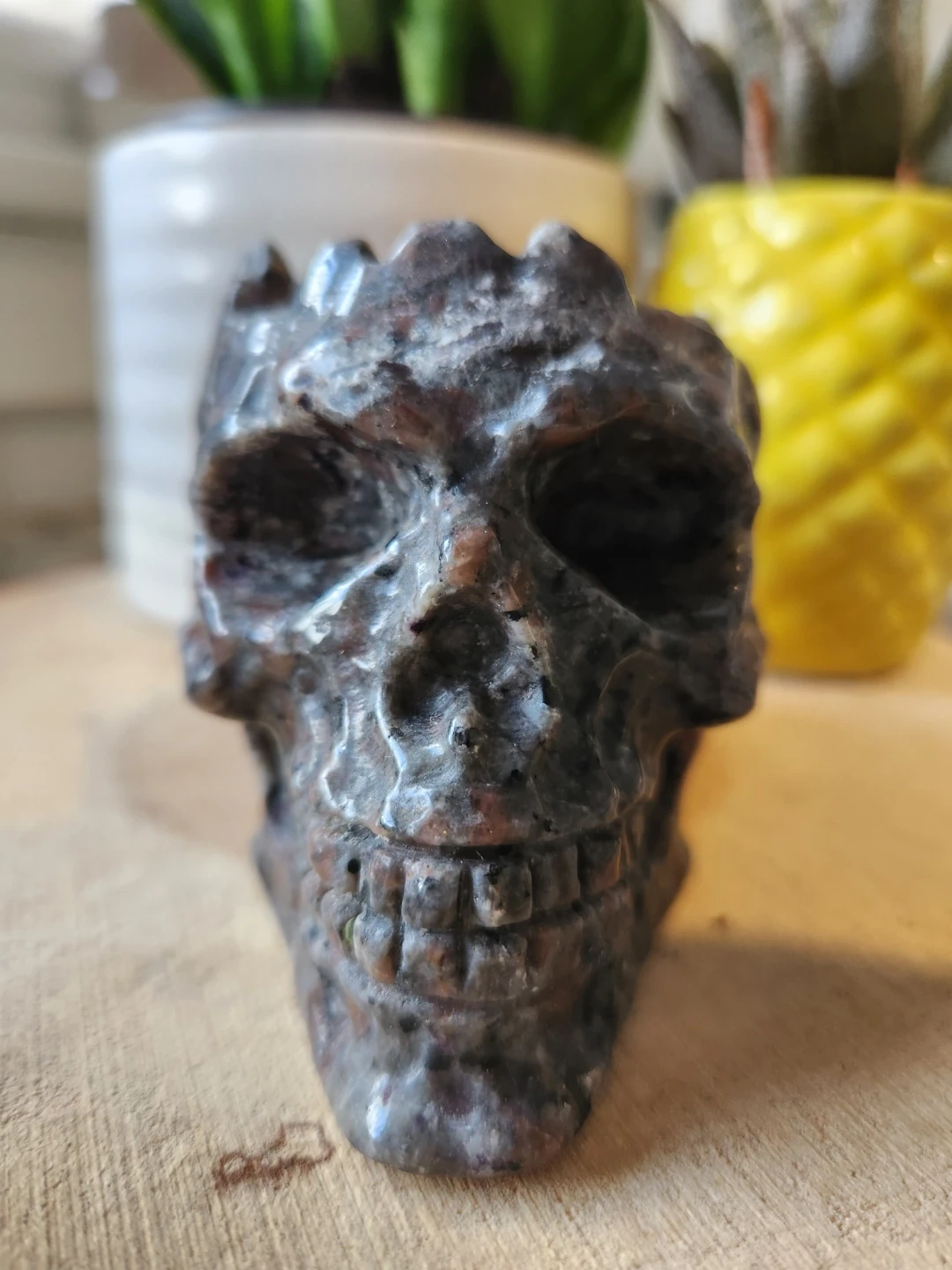 Dark, moody, and full of hidden magic, this Yooperlite skull bowl is a striking statement piece. Carved with detailed features and natural marbling in deep charcoal, grey, and subtle earthy tones, it carries a mysterious, almost ancient energy.