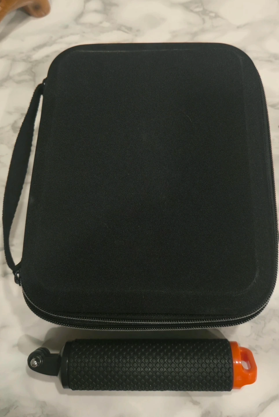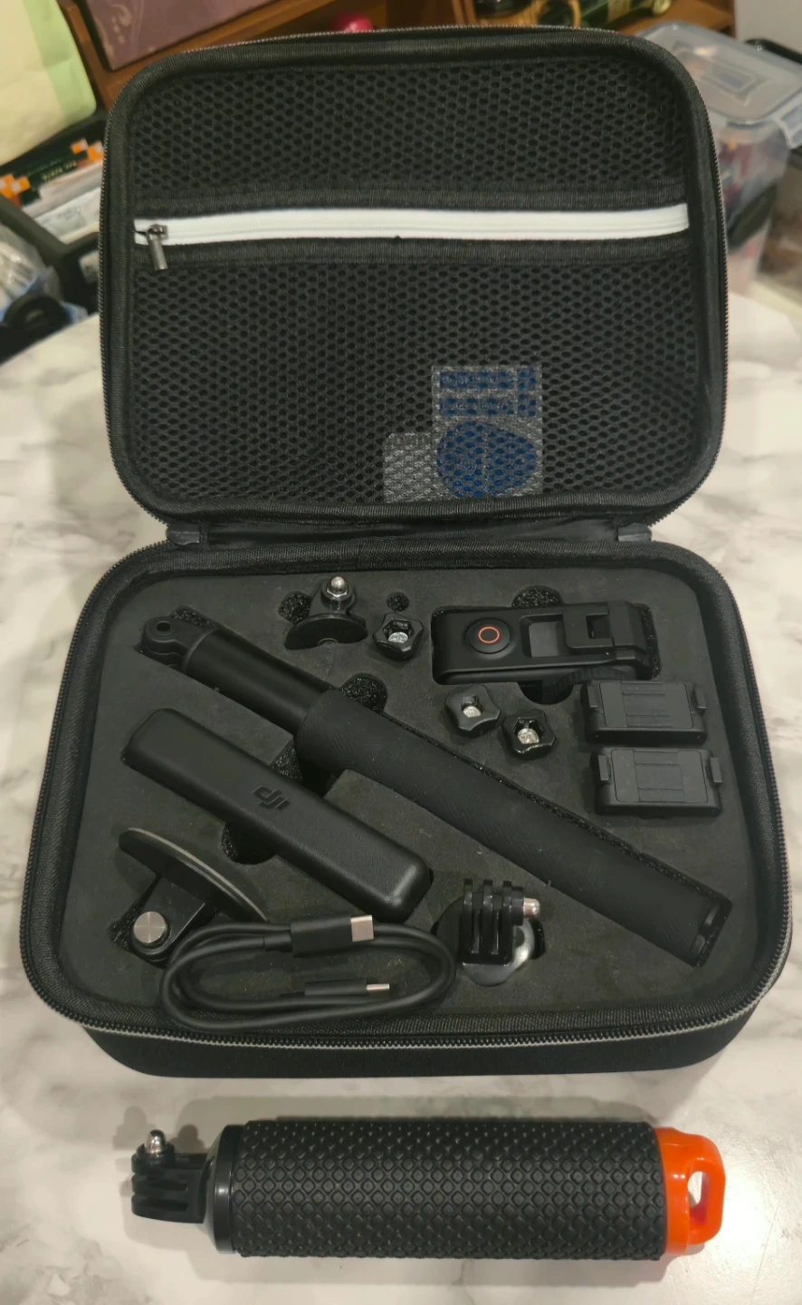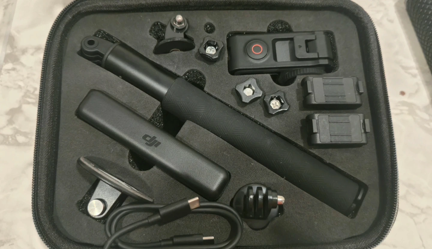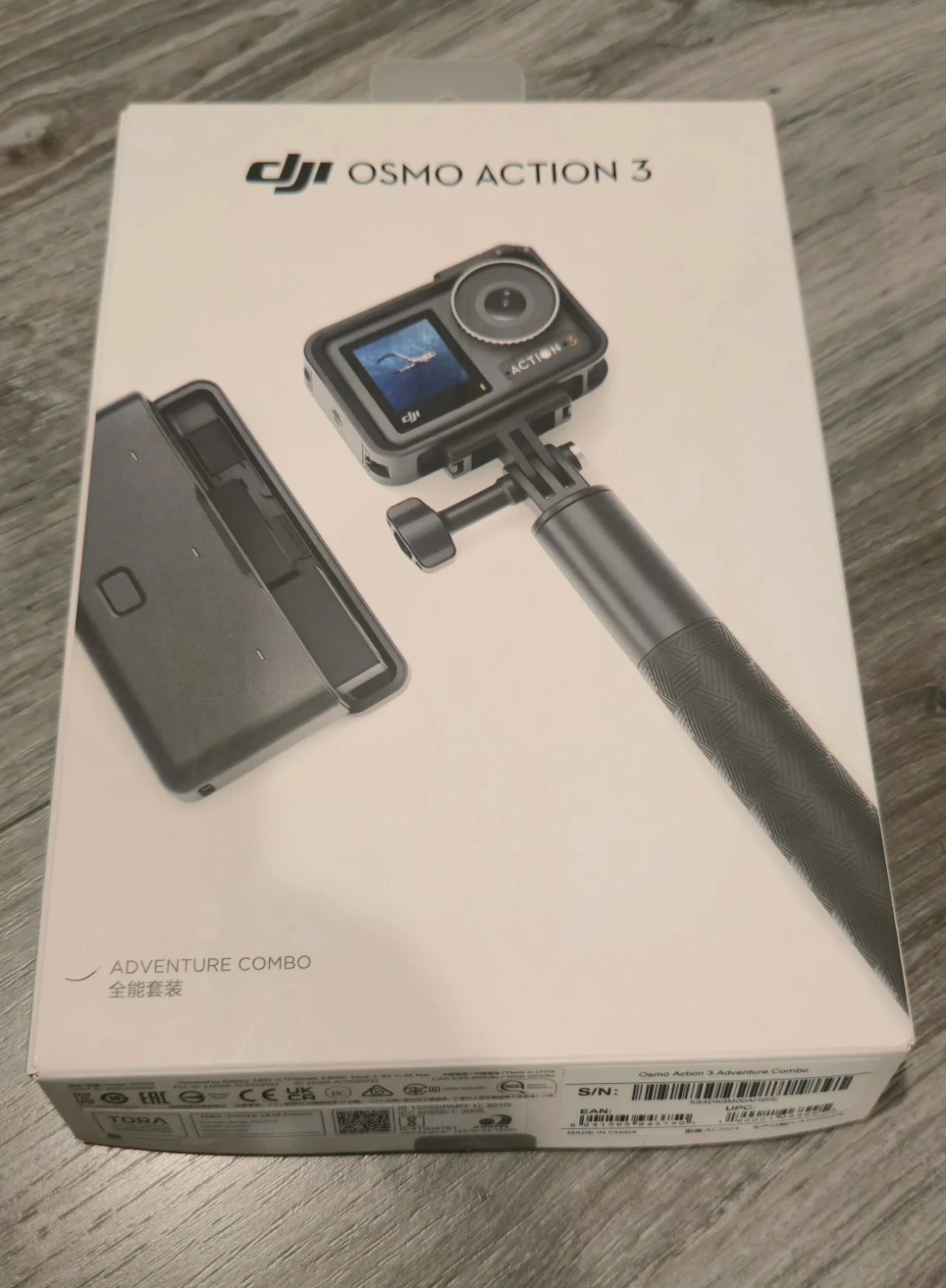 This is the DJI Osmo Action 3 camera with the Adventure Combo package. It includes the camera, a magnetic mounting frame, and various accessories for filming adventures. The combo also comes with a charging handle and extra batteries.