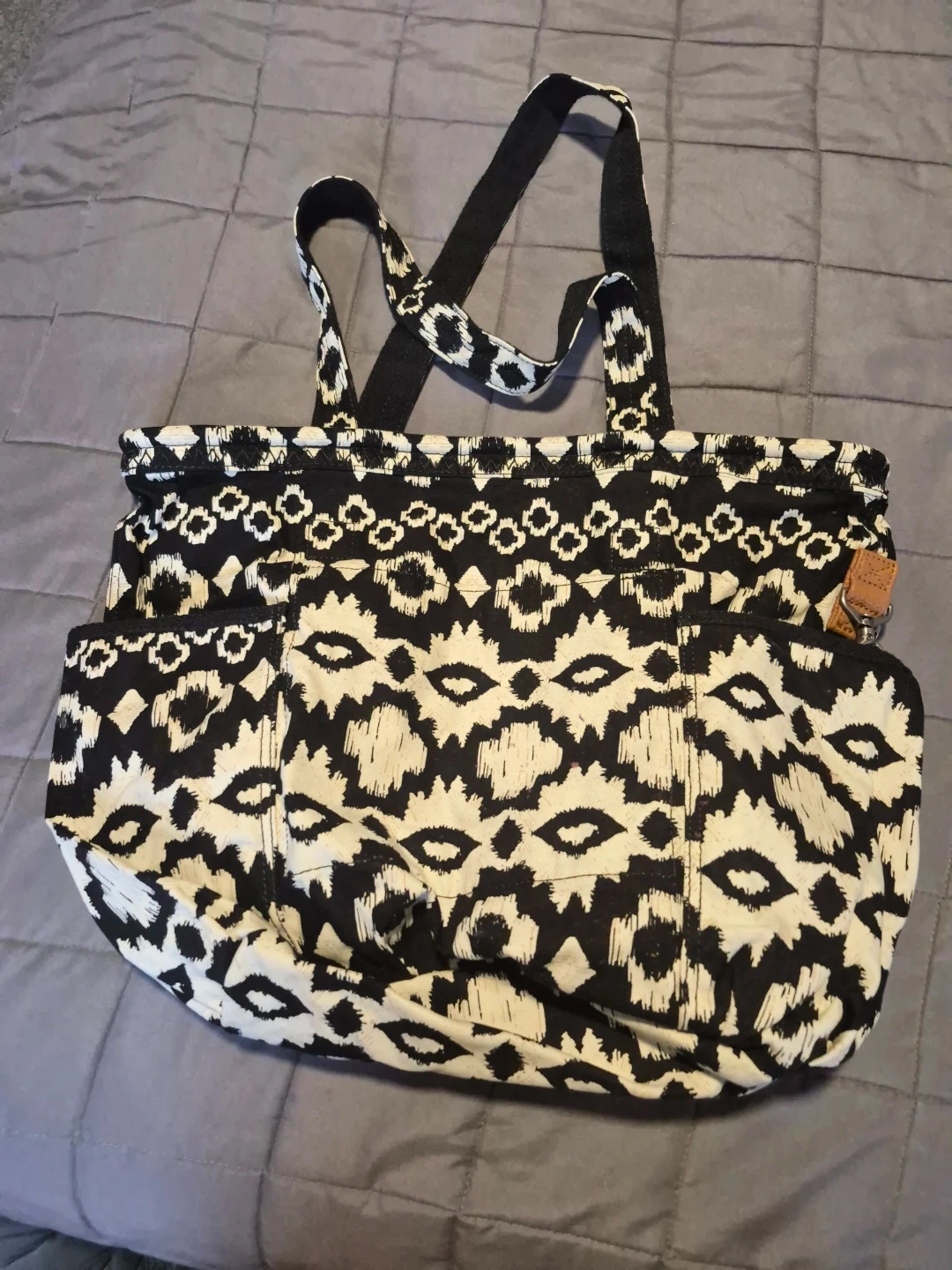 Spacious tote bag with a monochrome print. It features multiple exterior pockets and an interior zippered compartment. Fabric material.