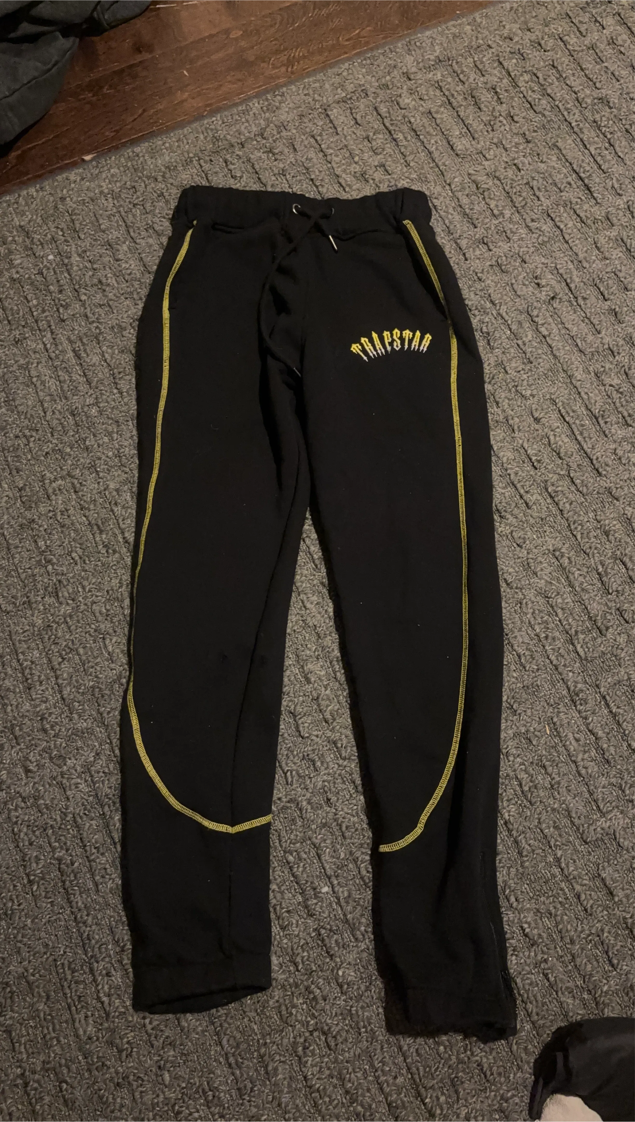 Black Trapstar joggers with distinctive yellow stitching along the sides. These pants feature a drawstring waist for a comfortable fit. Great for casual wear!