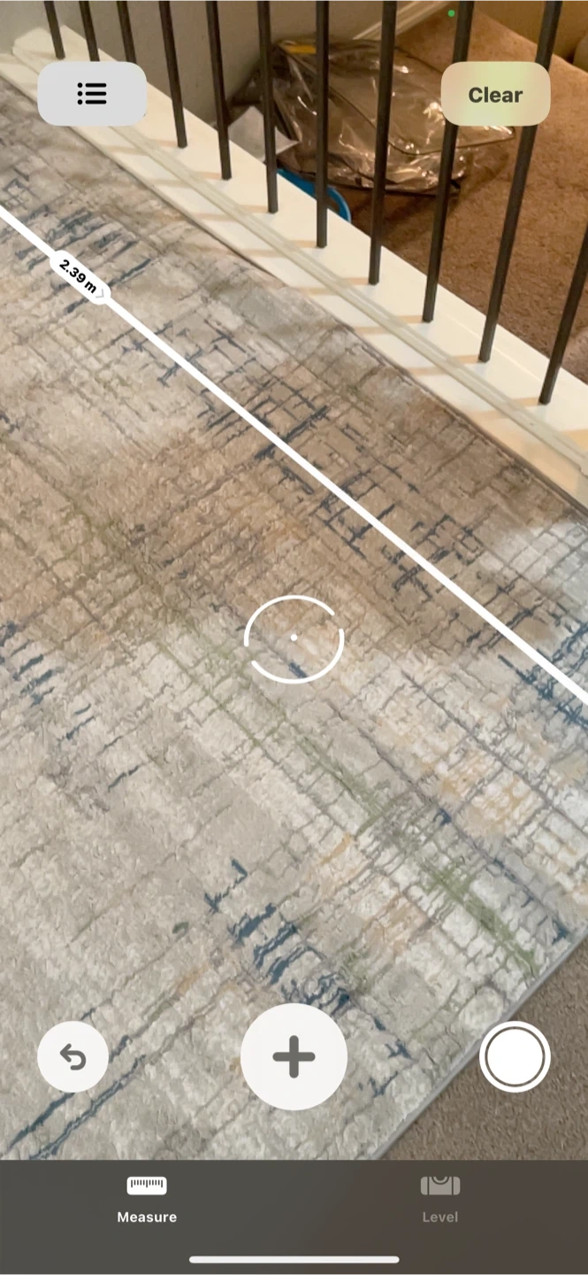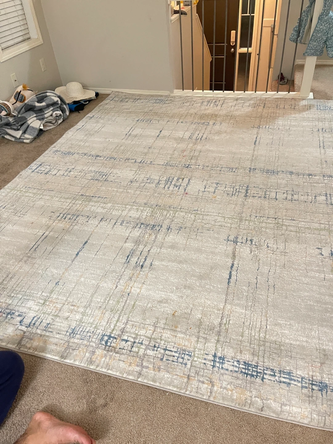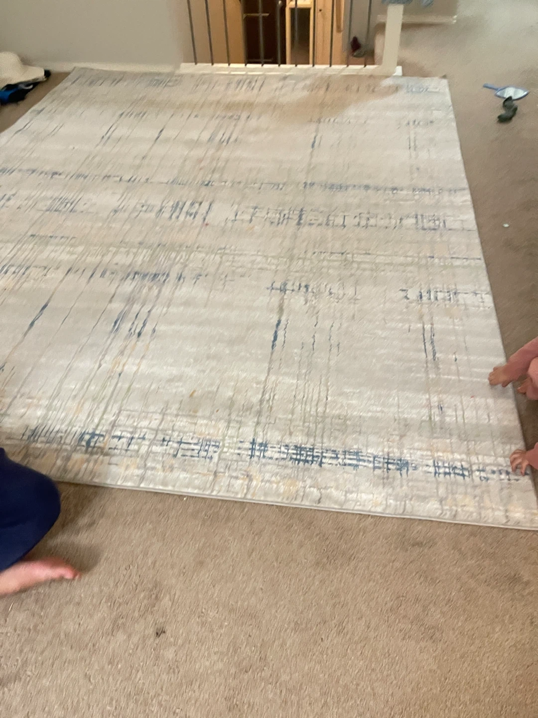 Nice area rug with a distressed pattern. Dimensions are approximately 2.39 m by 2.98 m. It's a light beige colour with blue and grey accents. Adds a cozy feel to any room!