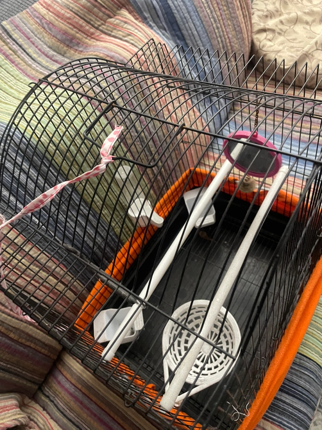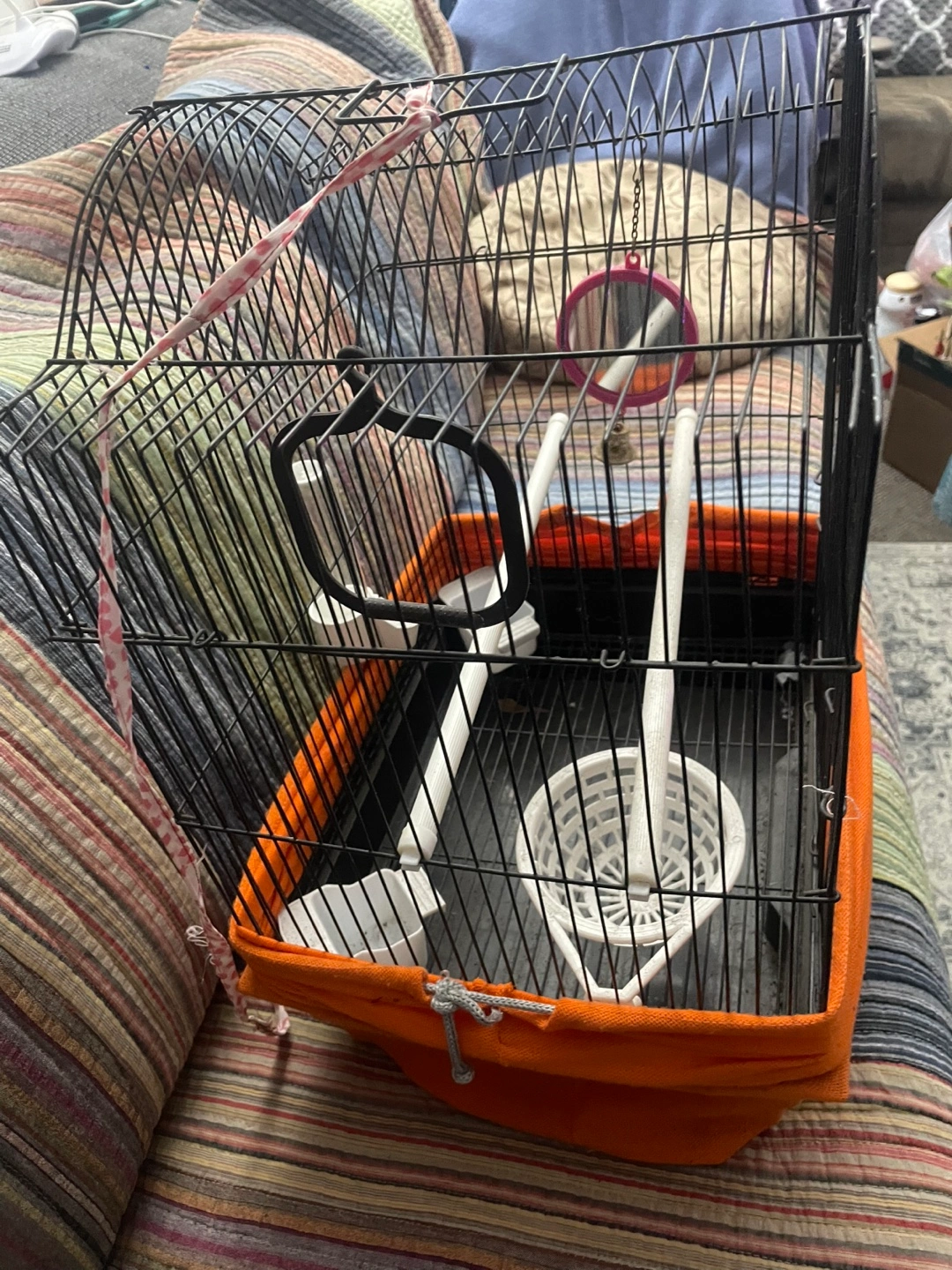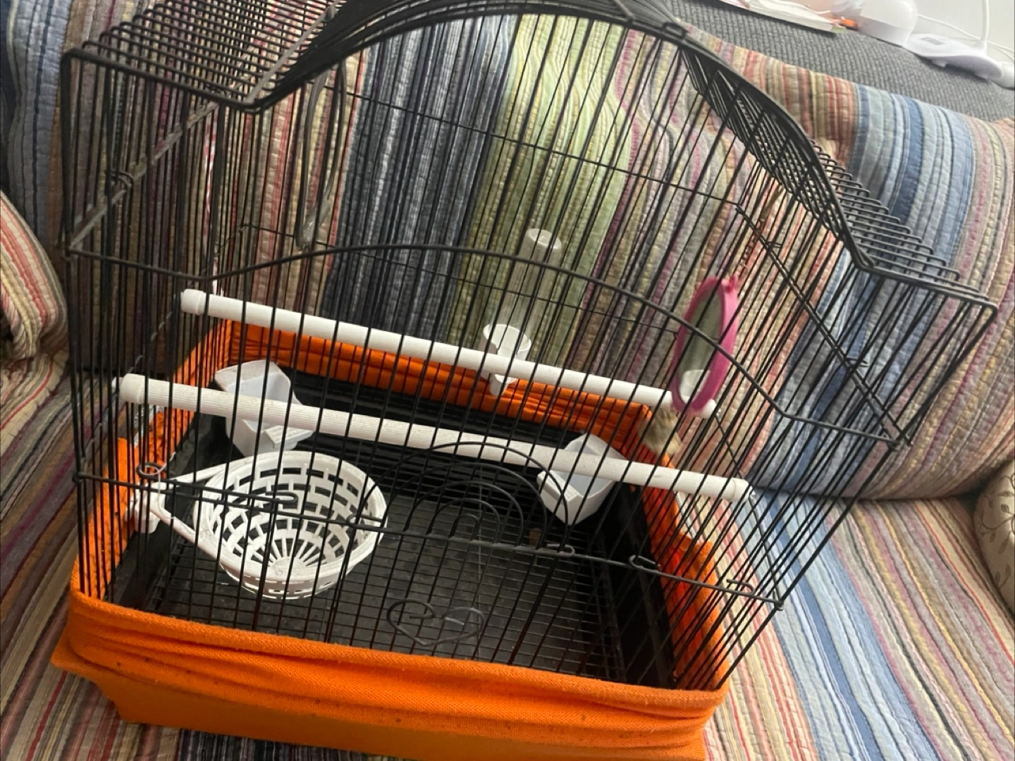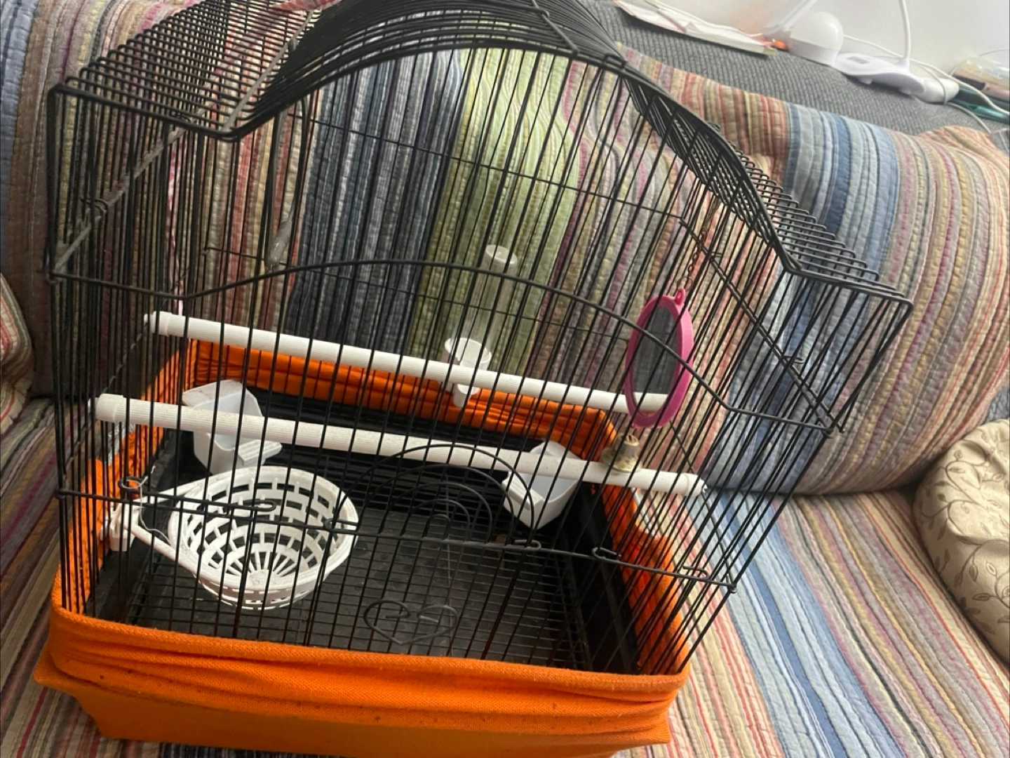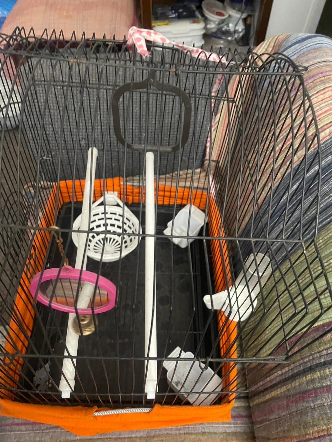 Black wire bird cage. Includes two perches, two food dishes, one water dish, and a mirror. Orange fabric liner around the bottom. Good for small birds.