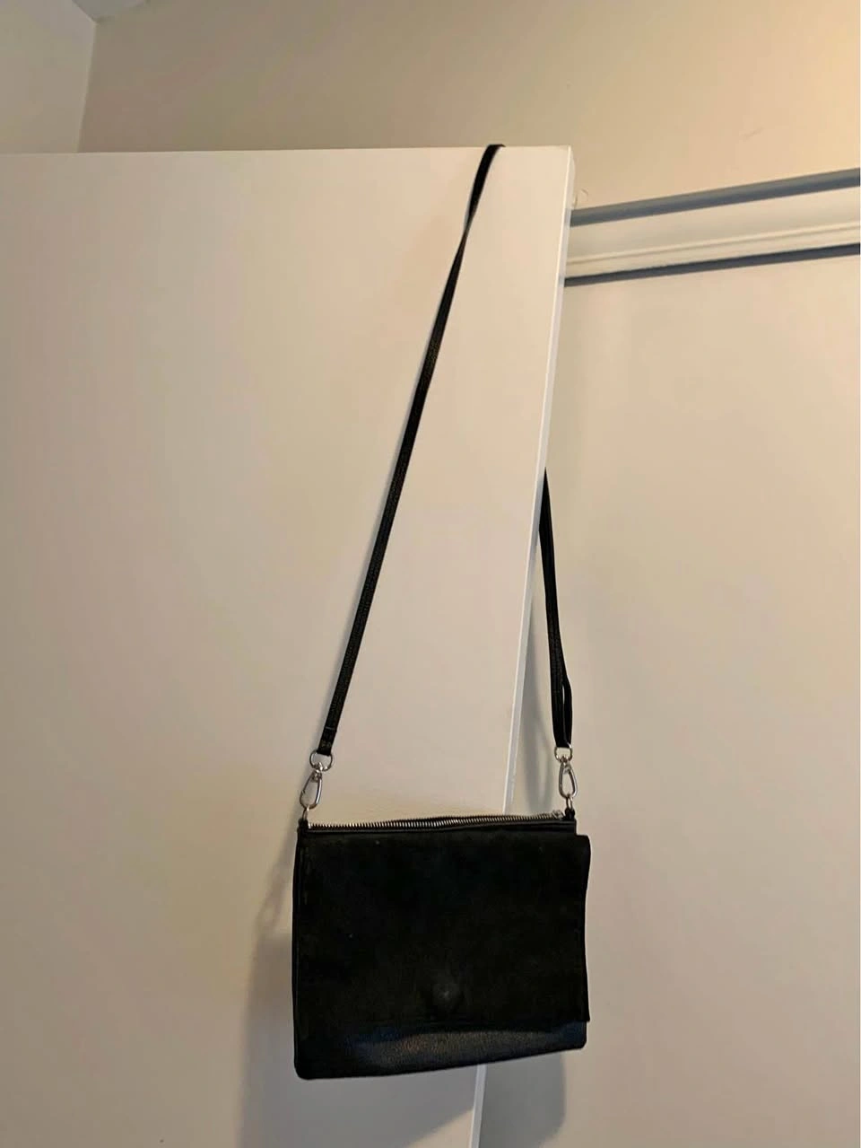 15Small shoulder bag in grained imitation leather with a zip at the top and narrow adjustable shoulder strap with carabiner hooks at each end. One outer compartment with an imitation suede flap and magnetic fastener. Lined.