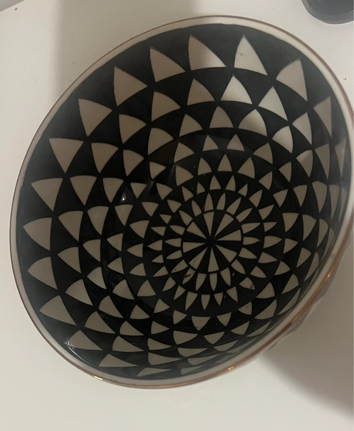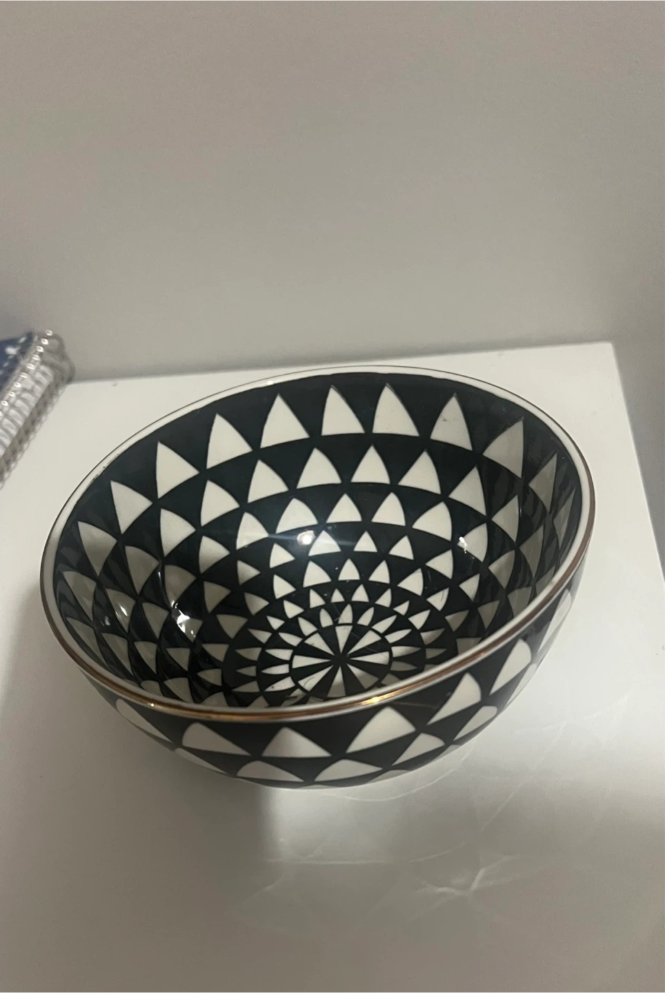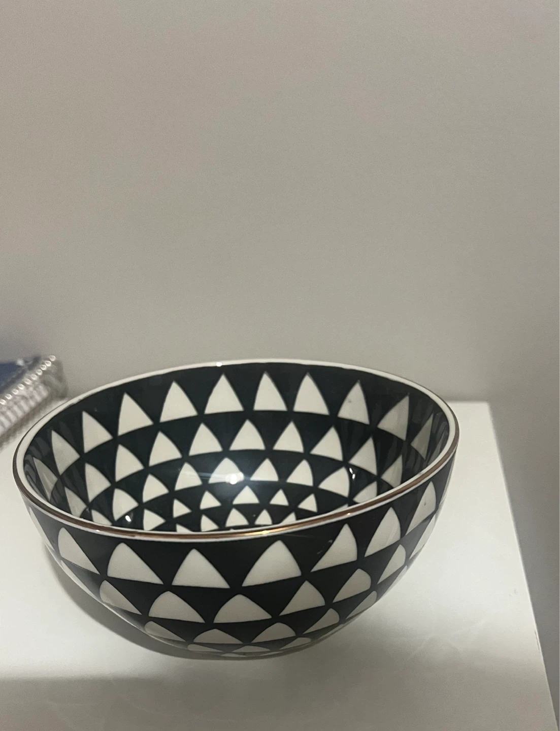 Selling a bowl with a cool black and white geometric pattern! It's in great condition and would look great as a decorative piece or for serving snacks