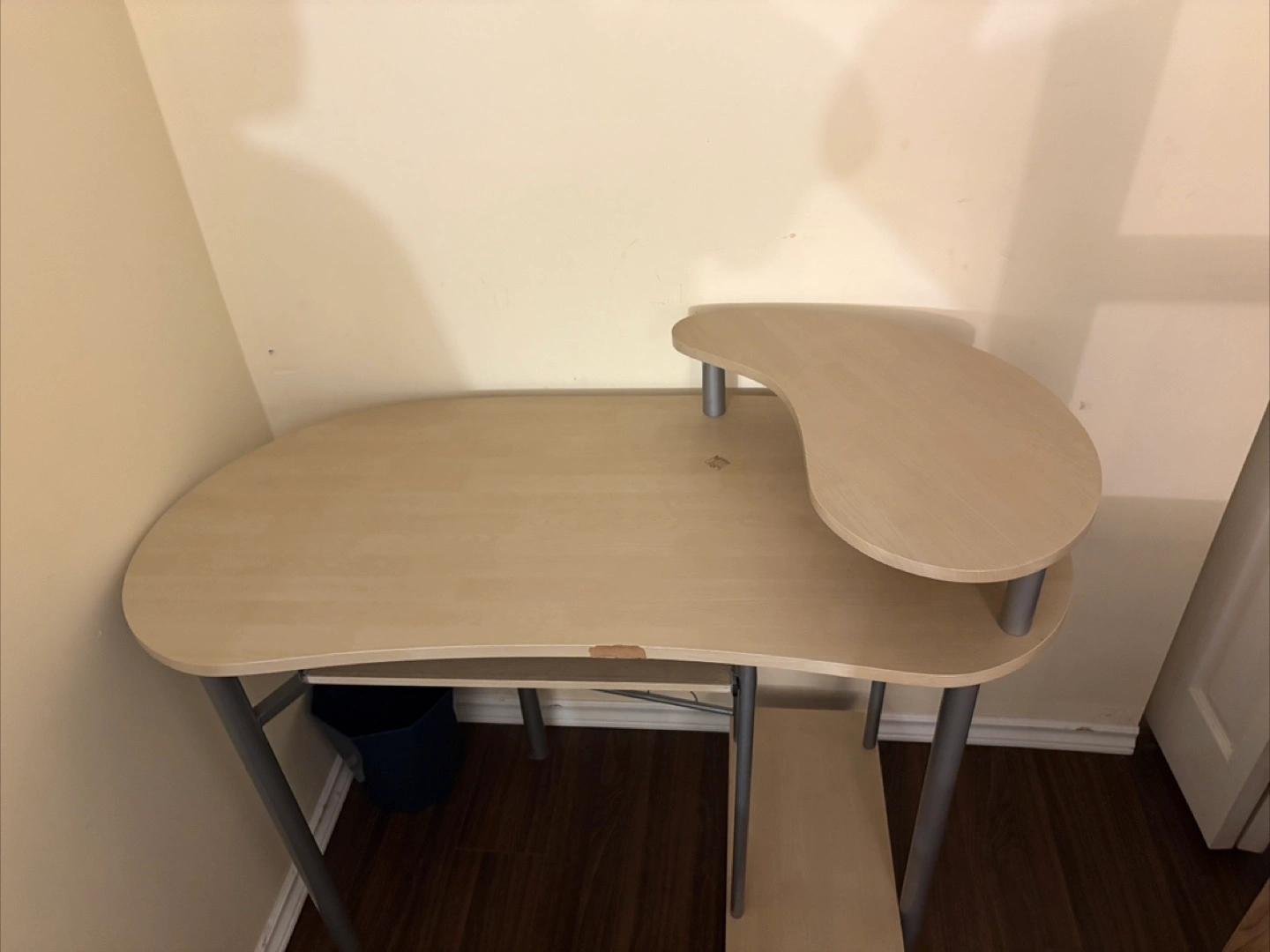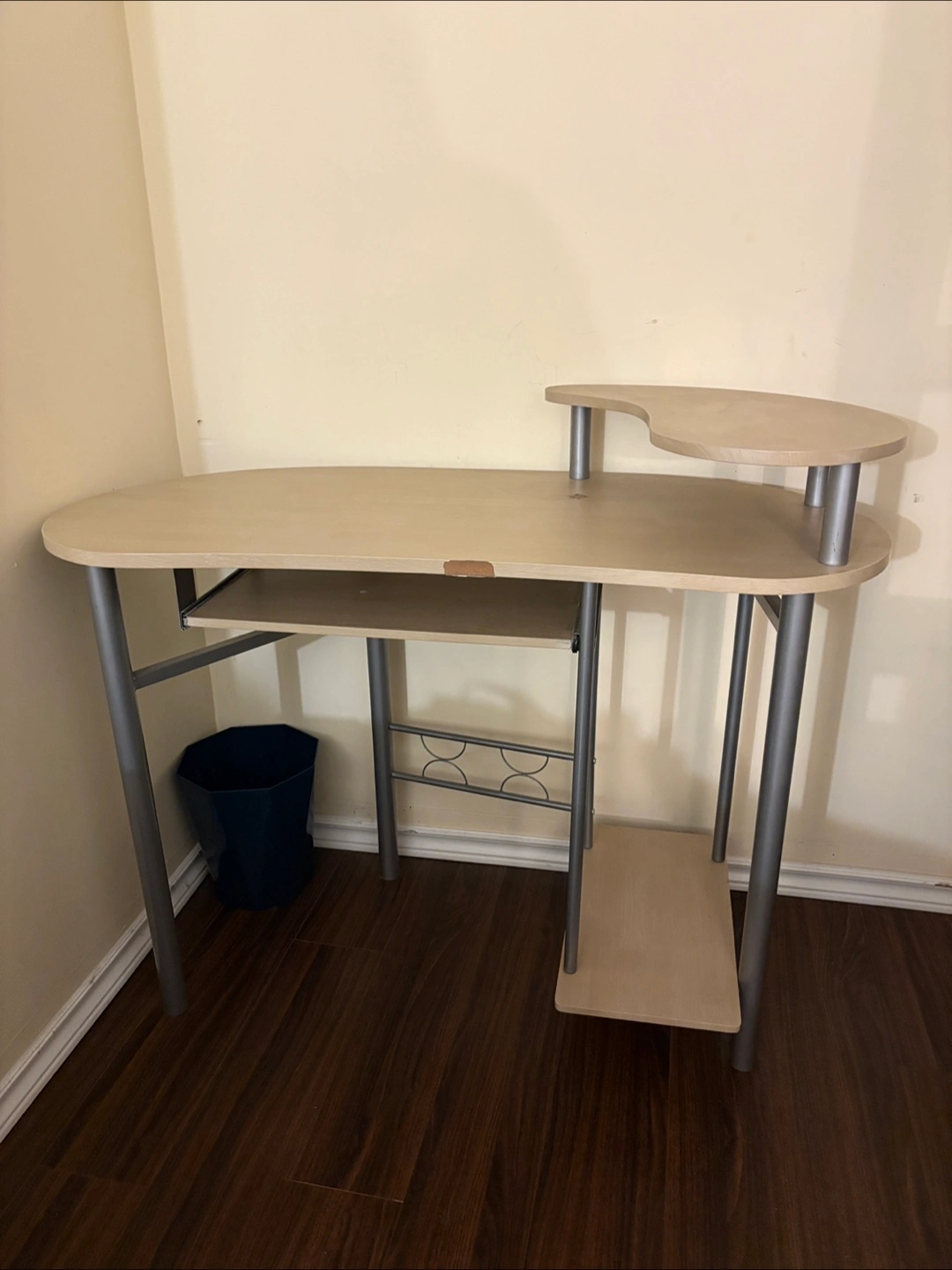 Selling a small computer desk that's perfect for tight spaces! It features a beige tabletop with silver legs and a unique curved design. It also has a shelf underneath for extra storage