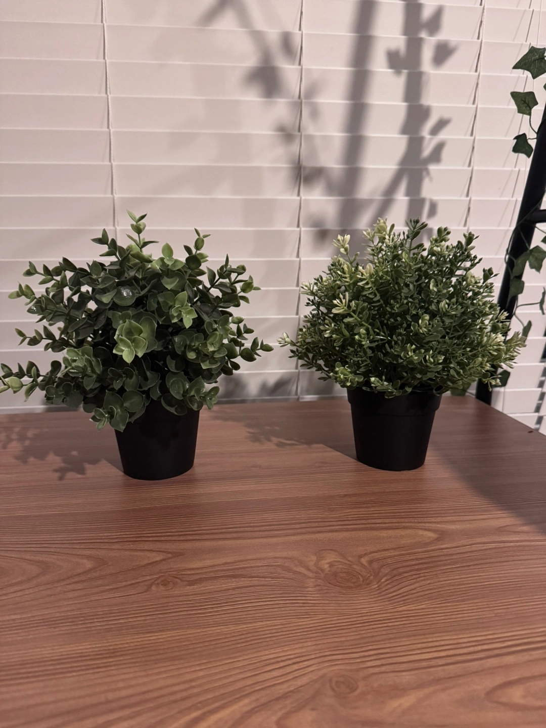 251Two small artificial plants in black pots. Lush green foliage. Would look great on a desk, helping create a relaxing environment.