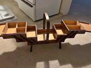 Lg sewing or jewelry box. Several compartments. Works very well open/close with ease. Handle for easy carry. No broken pieces.