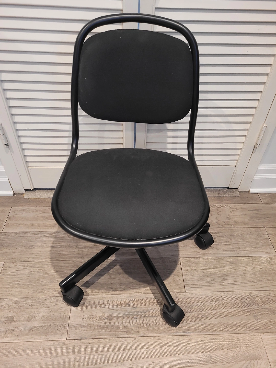 Small (kids) office Black Chair Selling a simple black office chair. It's in great shape and ready for a new home. The chair has a comfortable seat and back, and it rolls smoothly on its wheels. Perfect for a home office or study space!