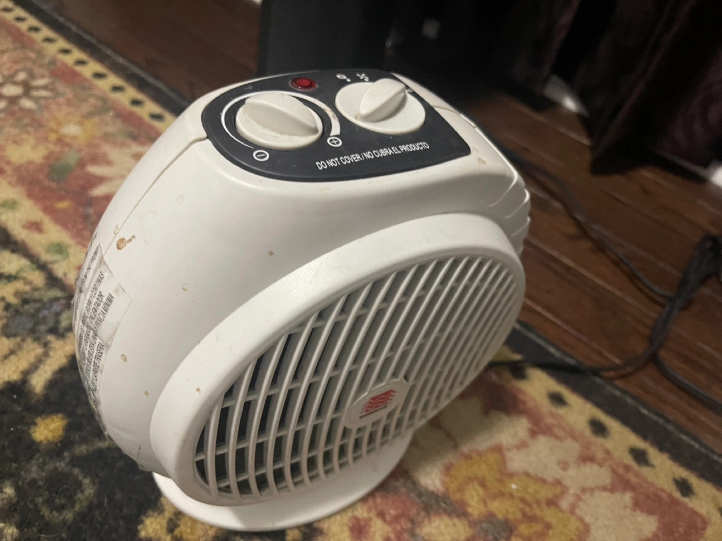 Portable ceramic heater. Features two heat settings and an oscillation function. Good for small spaces. Shows some minor cosmetic wear.