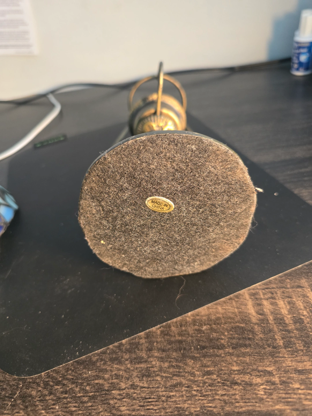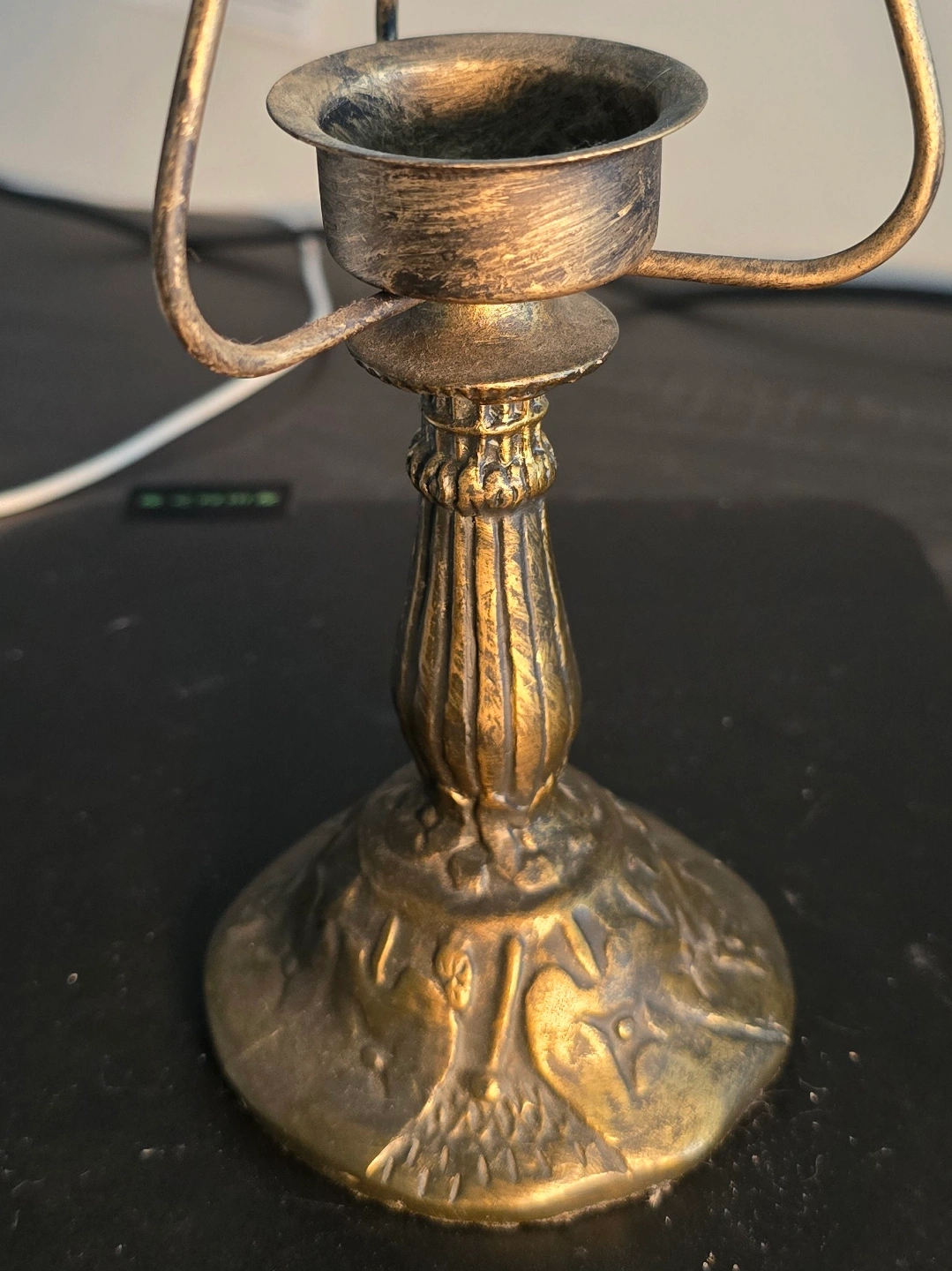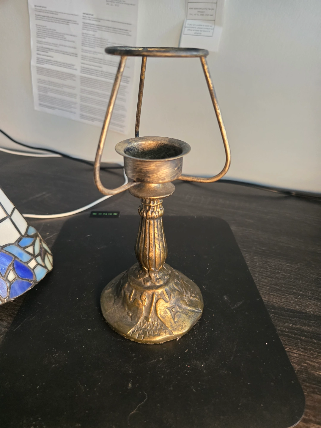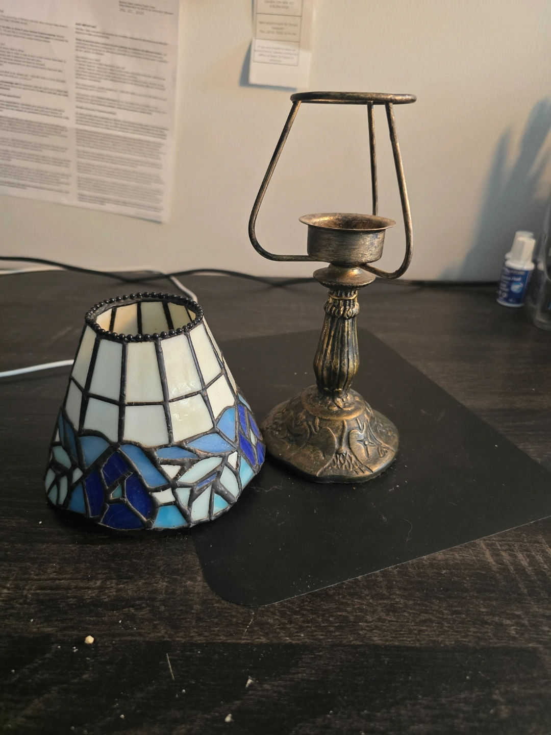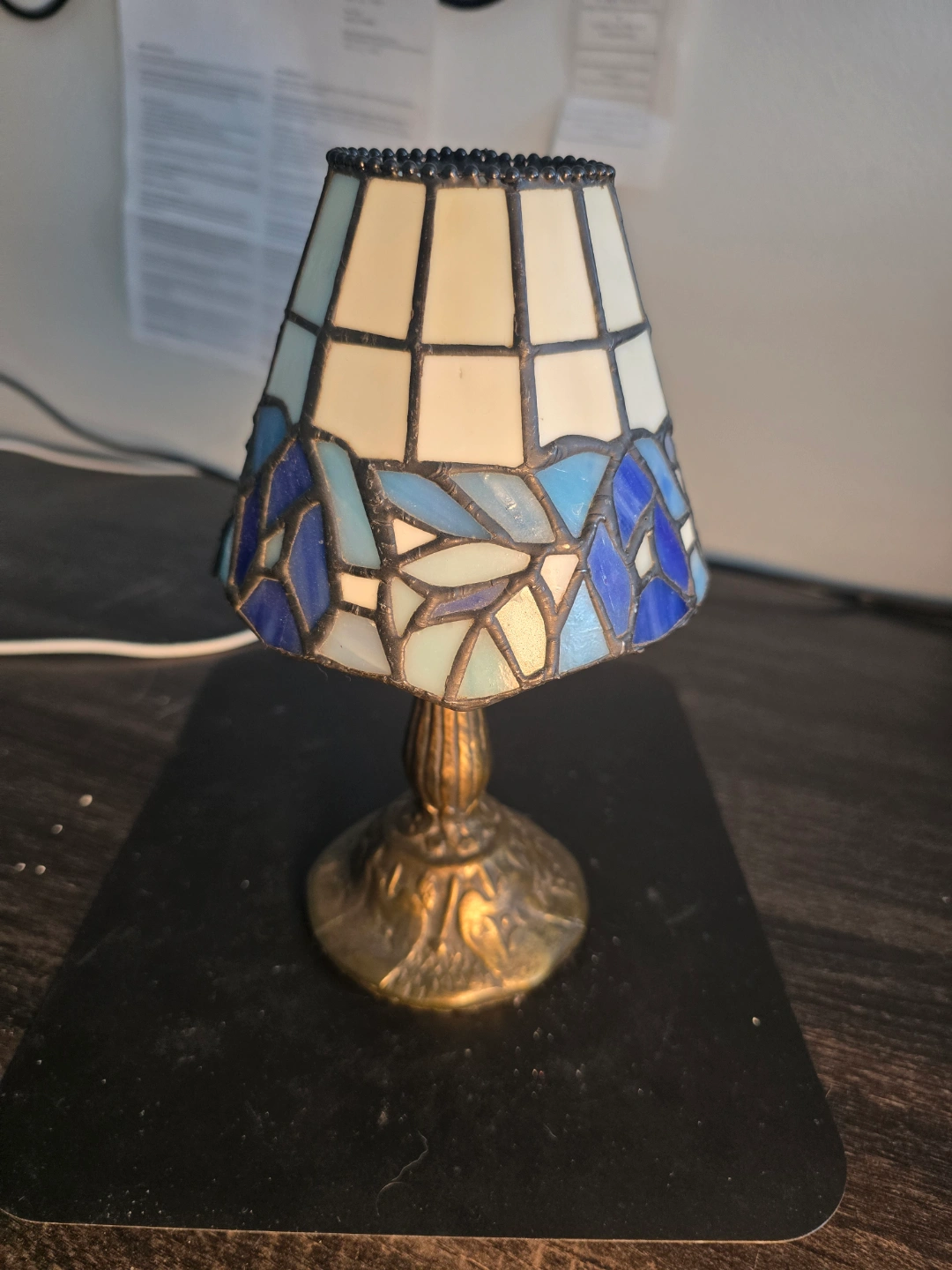 70Beautiful small table lamp. Features a stained glass shade in shades of blue and white. Metal base for a tea candle. Great for a bedside table or small space.